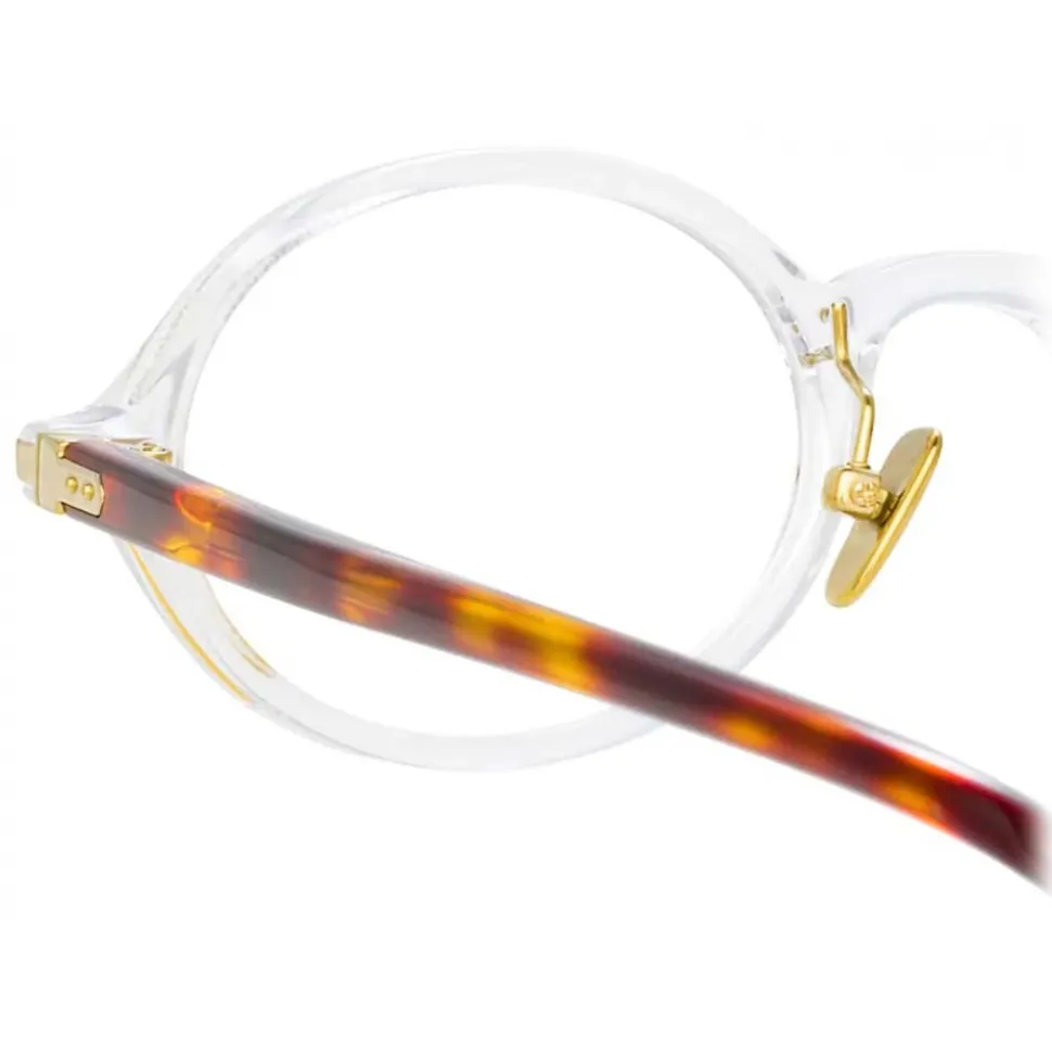 In a skinny oval silhouette, these men’s optical glasses from the Linda Farrow LINEAR collection pair clear and tortoiseshell Italian acetate with 18-22 carat luna gold-plated Japanese titanium.