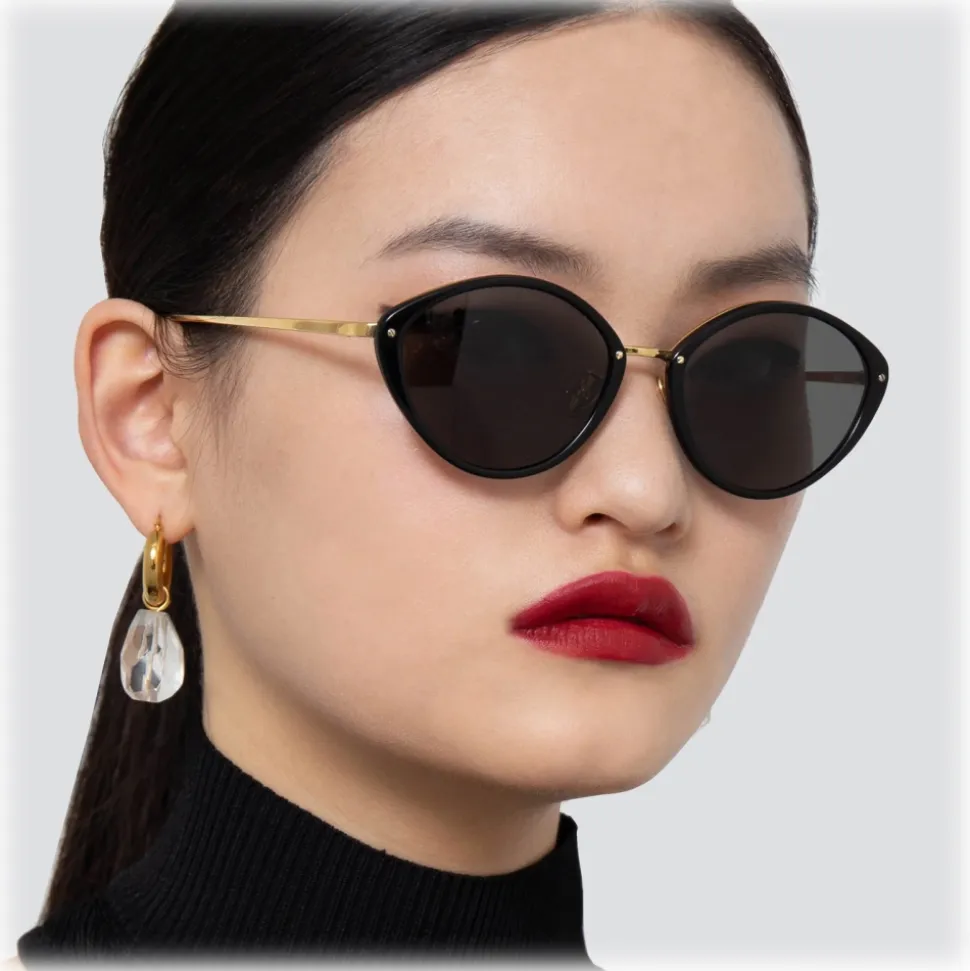 These delicate cat eye sunglasses from the LINDA FARROW collection employ a signature design language of the brand. Expertly polished recycled black acetate rims are paired with a 22 carat yellow gold plated exposed titanium frame work running along the inner brow of the style.