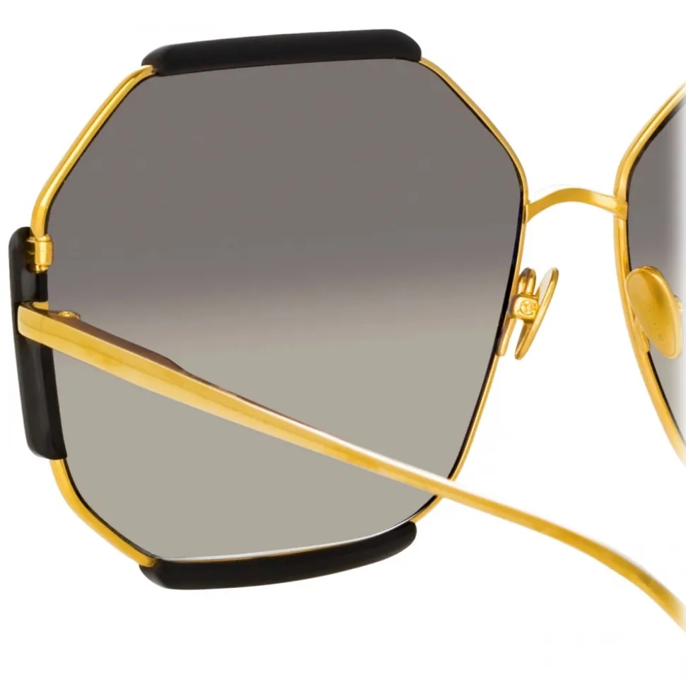 Reminiscent of 1970s playful allure these hexagon sunglasses channel a quintessential LINDA FARROW design language. A delicate 22 carat yellow gold plated titanium rim is accented with glossy black acetate details.