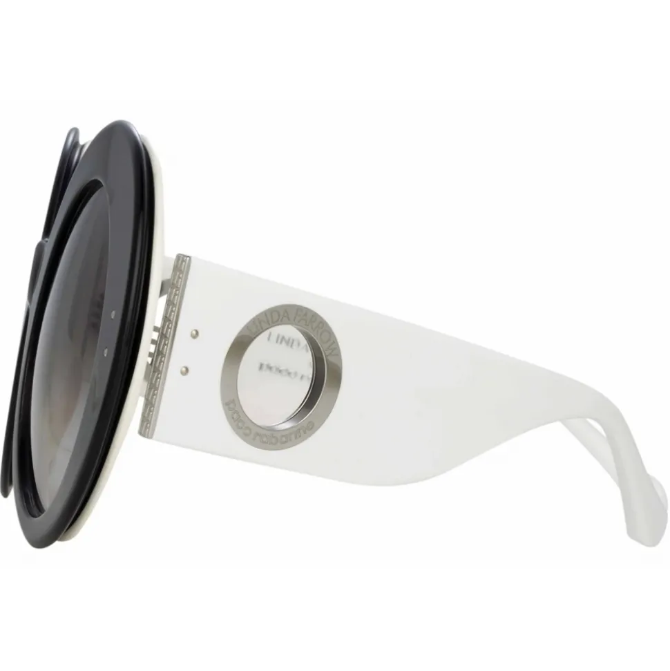 Introducing the LINDA FARROW x PACO RABANNE collaboration, the partnership a celebration of the defiant spirit of both brands. The Donyale takes its name from Donyale Luna, one of the models for the first Paco Rabanne shows. The frame is sculpted in layers for a striking finish. The outer surface of the bold silhouette is realised in recycled black acetate with a contrasting optic white frame layered on the inside. Wide white acetate temples are inset with statement 22 carat white gold plated titanium eyelets, engraved with both logos to celebrate the collaboration. Fitted with grey graduated lenses which offer anti-glare and 100% UV protection. The frame is finished with sculpted nose pads and temple tips for a comfortable fit.