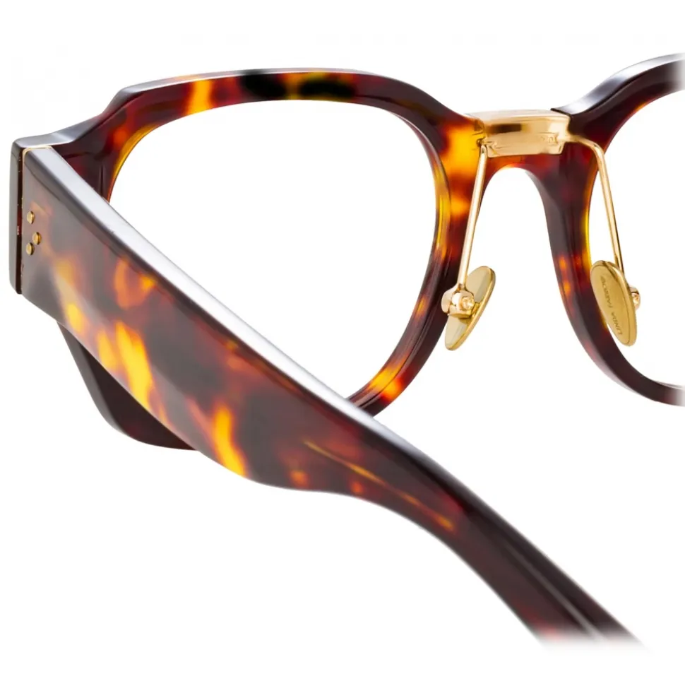 An experimentation of angles and facets the Ramon optical glasses from the LINDA FARROW collection is our take on a classic acetate frame. The dark tortoise shell acetate frame is beveled for intriguing texture and elevated with delicate 22 carat light gold titanium detailing at the bridge. Adjustable titanium nose pads allow a tailored fit for comfort. The frames are completed with discreet logo detailing inset into the temple tip.