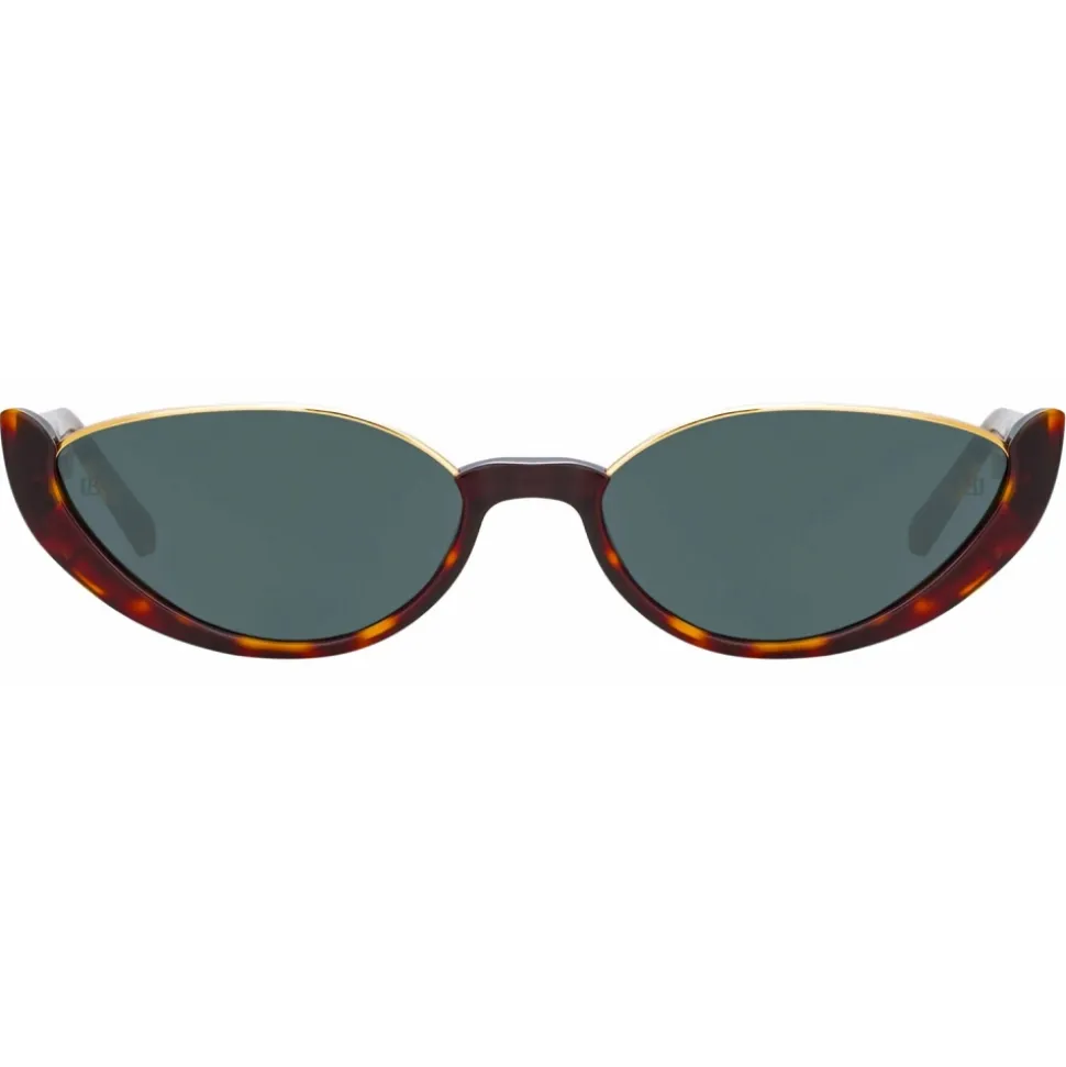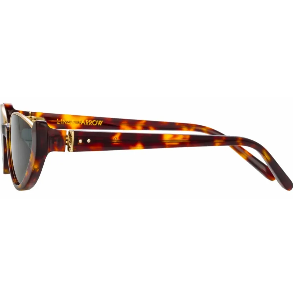 These feminine cat eye sunglasses from the LINDA FARROW collection exude a refined glamour. The Robyn is sculpted from dark tortoiseshell acetate which sweeps below the lens to form a delicate half rim, joined by fine 22 carat yellow gold plated titanium running along the brown.
