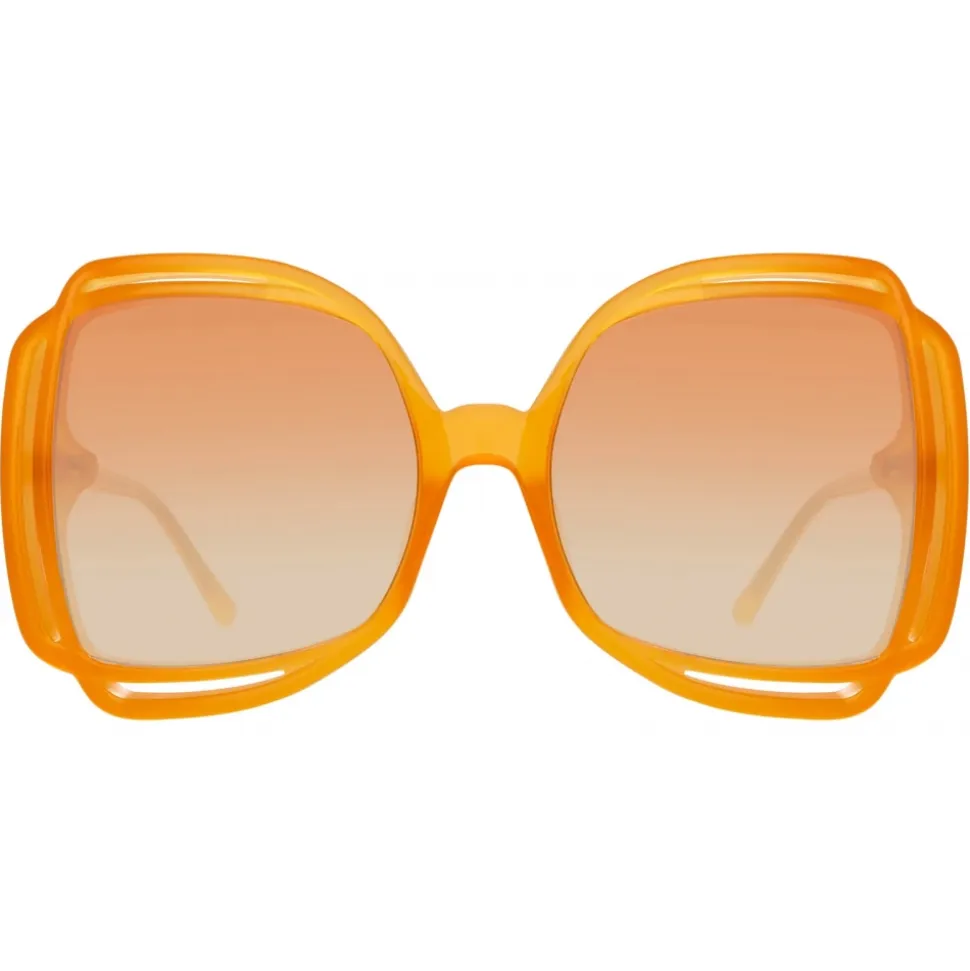 Layered acetate encircles square lenses to form these oversized sunglasses from the LINDA FARROW collection. Sculpted from orange acetate the framework carries delicate cut out detailing. Fitted with orange graduated lenses which offer anti-glare and 100% UV protection. The style is completed with 22 carat yellow gold plated titanium hardware.
