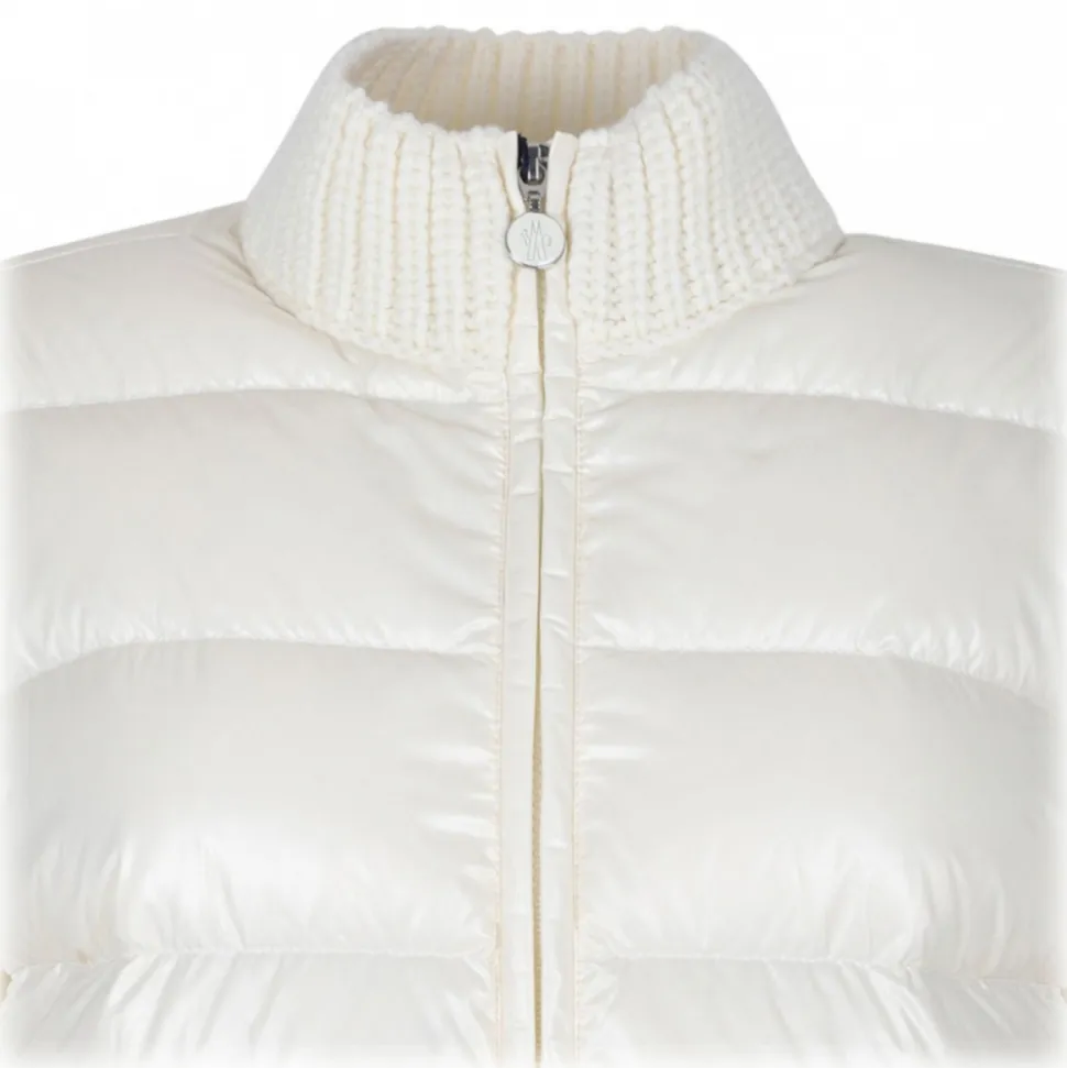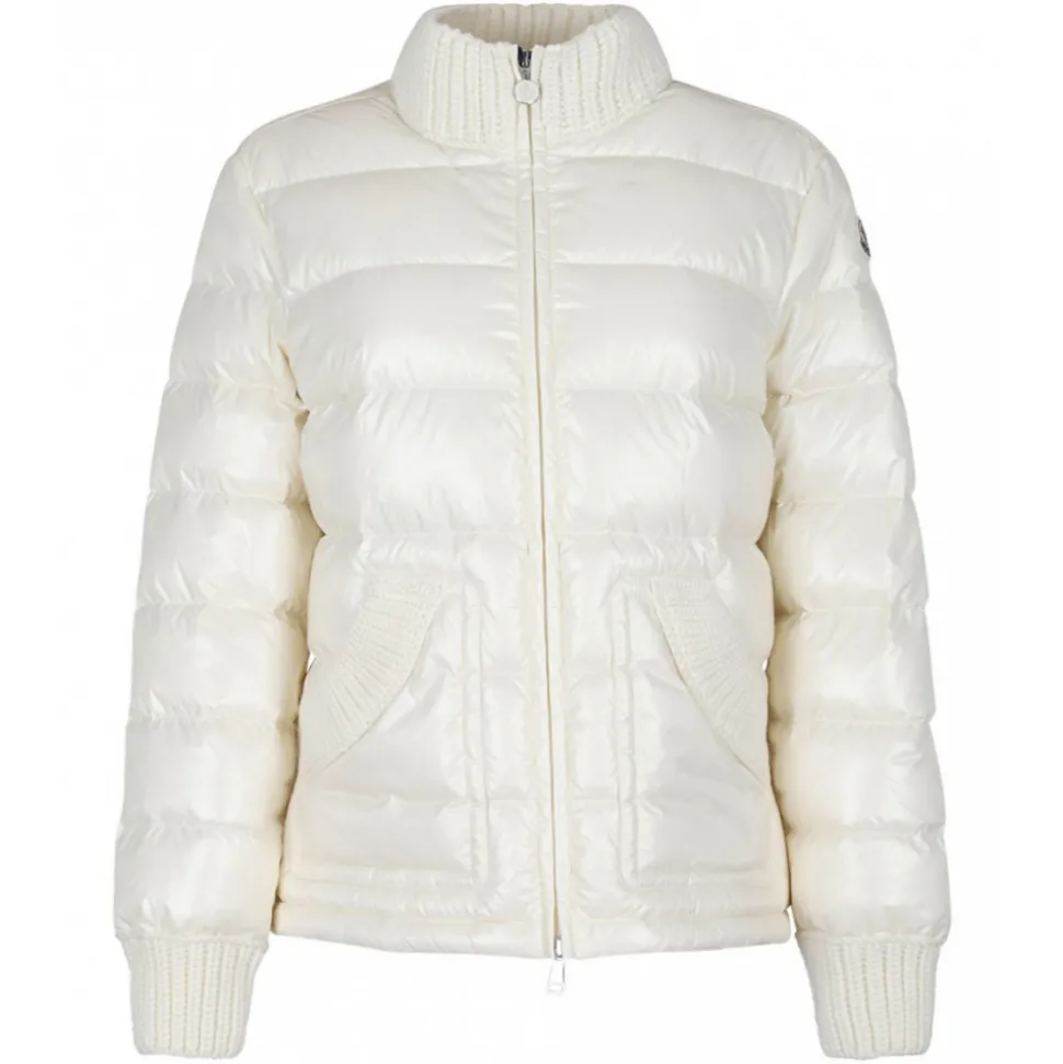 Moncler White Arcelot Short Down Jacket. Outer crafted in white laqué tech fabric with a feather padding. Ribbed high neck, long sleeves, ribbed cuffs, front zip fastening, two front patch pockets with ribbed details, Moncler logo patch, straight hem.