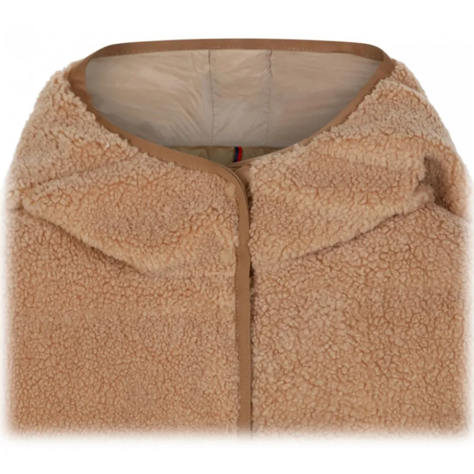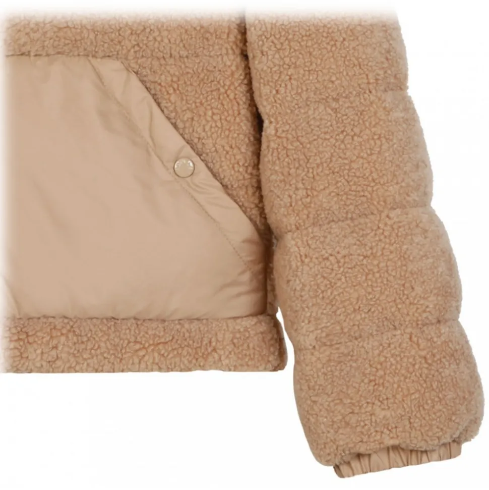 Moncler Audrieu Padded Jacket. Camel brown taupe faux shearling, feather down, padded design quilted jacket. Classic hood, long sleeves, logo patch at the sleeve, elasticated cuffs. Two press stud fastening, side pockets. Straight hem, full lining, front press stud and zip fastening.