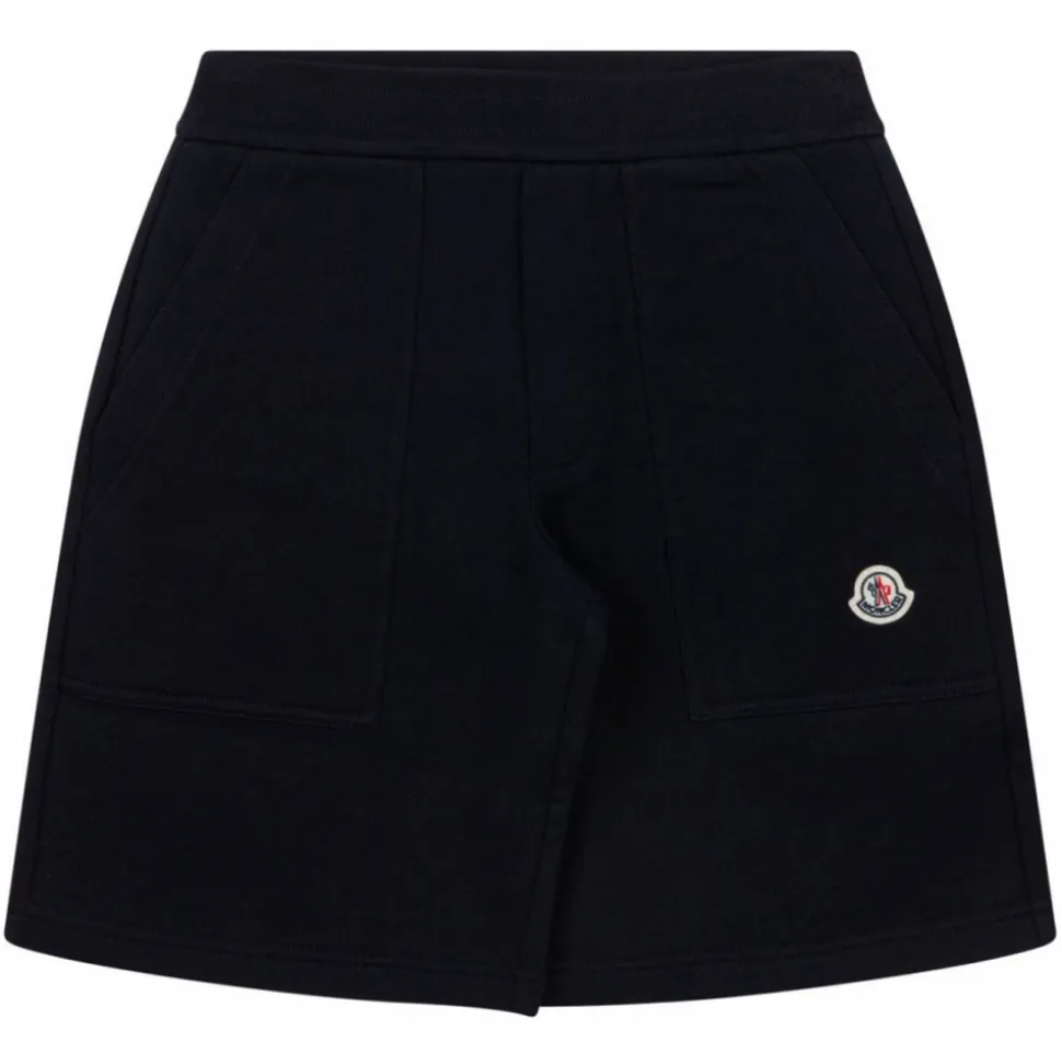 Moncler Kids Black Logo Patch Shorts. Black cotton shorts, jersey texture, logo patch to the front, elasticated waistband. Four front patch pockets, unlined, thigh length, straight hem.