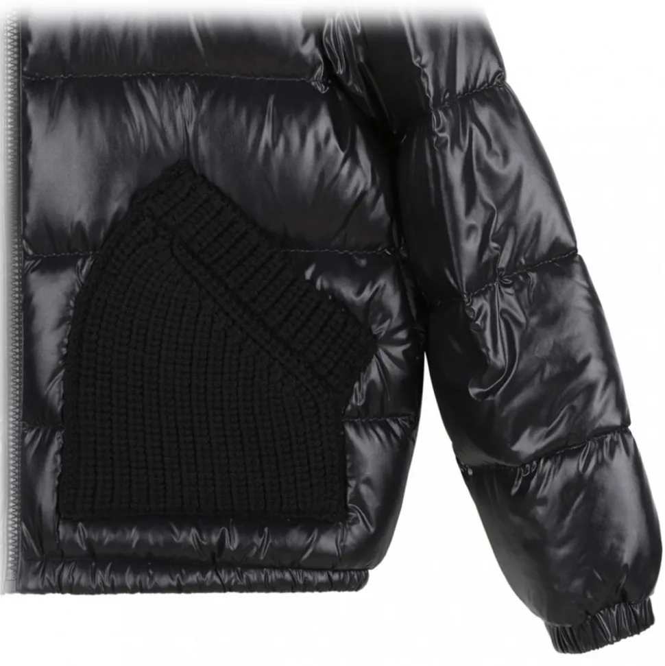 Moncler Enfant Black Puffer Jacket. Black padded design jacket, down-feather filling, quilted and metallic sheen. Knitted panels, logo patch at the sleeve, funnel neck and front zip fastening. Branded zip puller, long sleeves, elasticated cuffs, two side pouch pockets and elasticated hem.