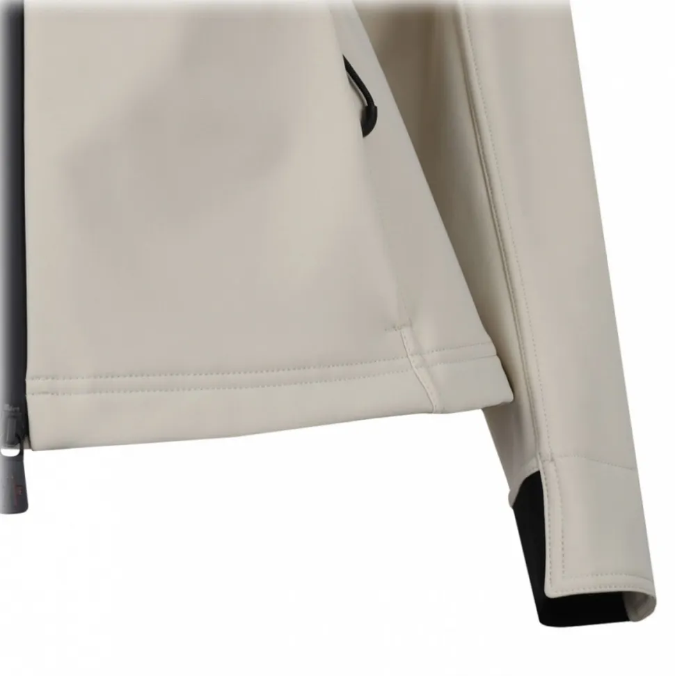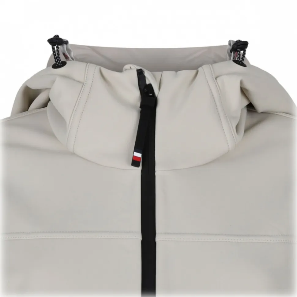 Moncler Grenoble Zumeles Jacket. Light beige jacket, model with djustable hood with drawstring, double-slider zip fastening on the front, two side welt pockets, iconic brand logo patch applied on the left sleeve, monochrome pattern, regular fit.