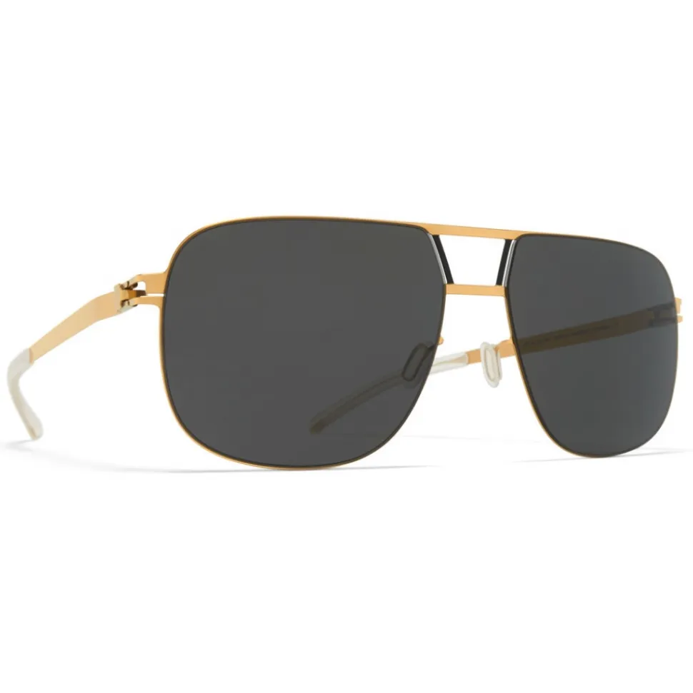 Made of lightweight stainless steel, AL in Gold/Black with Dark Grey Solid lenses is an aviator-shaped sunglass frame from the MYKITA NO1 collection. Handcrafted in Berlin.