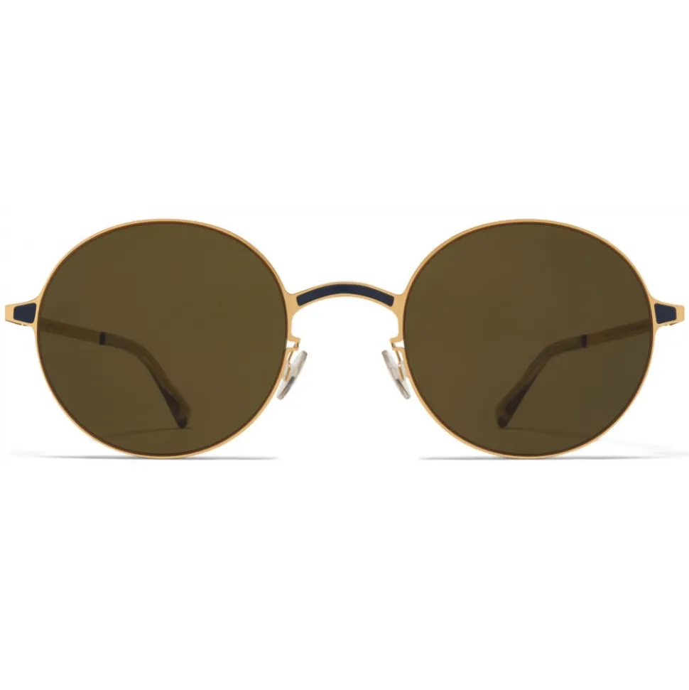 Made of lightweight stainless steel and slender acetate, BLU in Gold/Indigo with Raw Green Solid lenses is a round-shaped sunglass frame from the MYKITA LITE ACETATE collection. Handcrafted in Berlin.