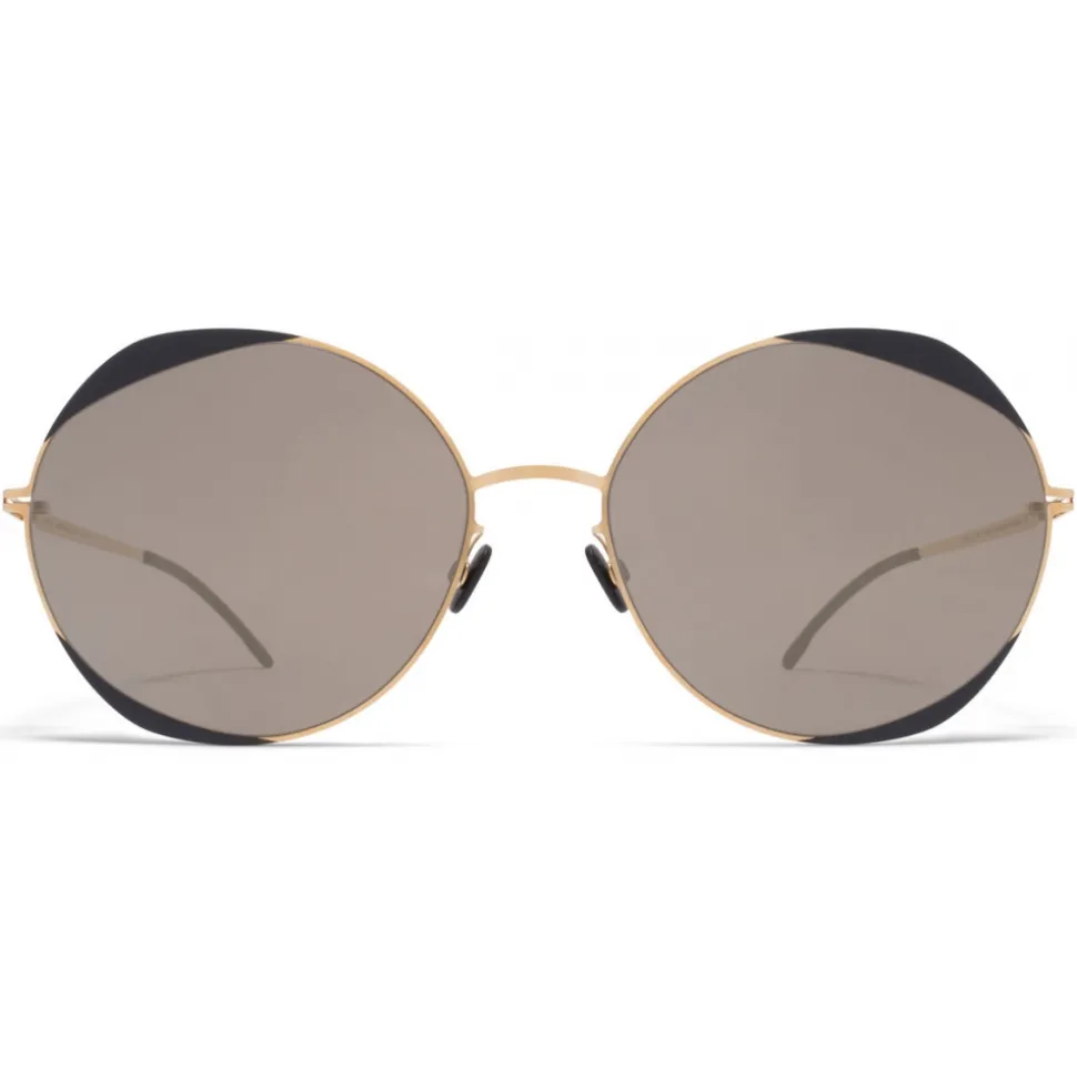 Made of lightweight stainless steel, ELISA in Gold/Jet Black with Brilliant Grey Solid lenses is a round-shaped sunglass frame from the MYKITA DECADES collection with a geometric rim design. Handcrafted in Berlin.