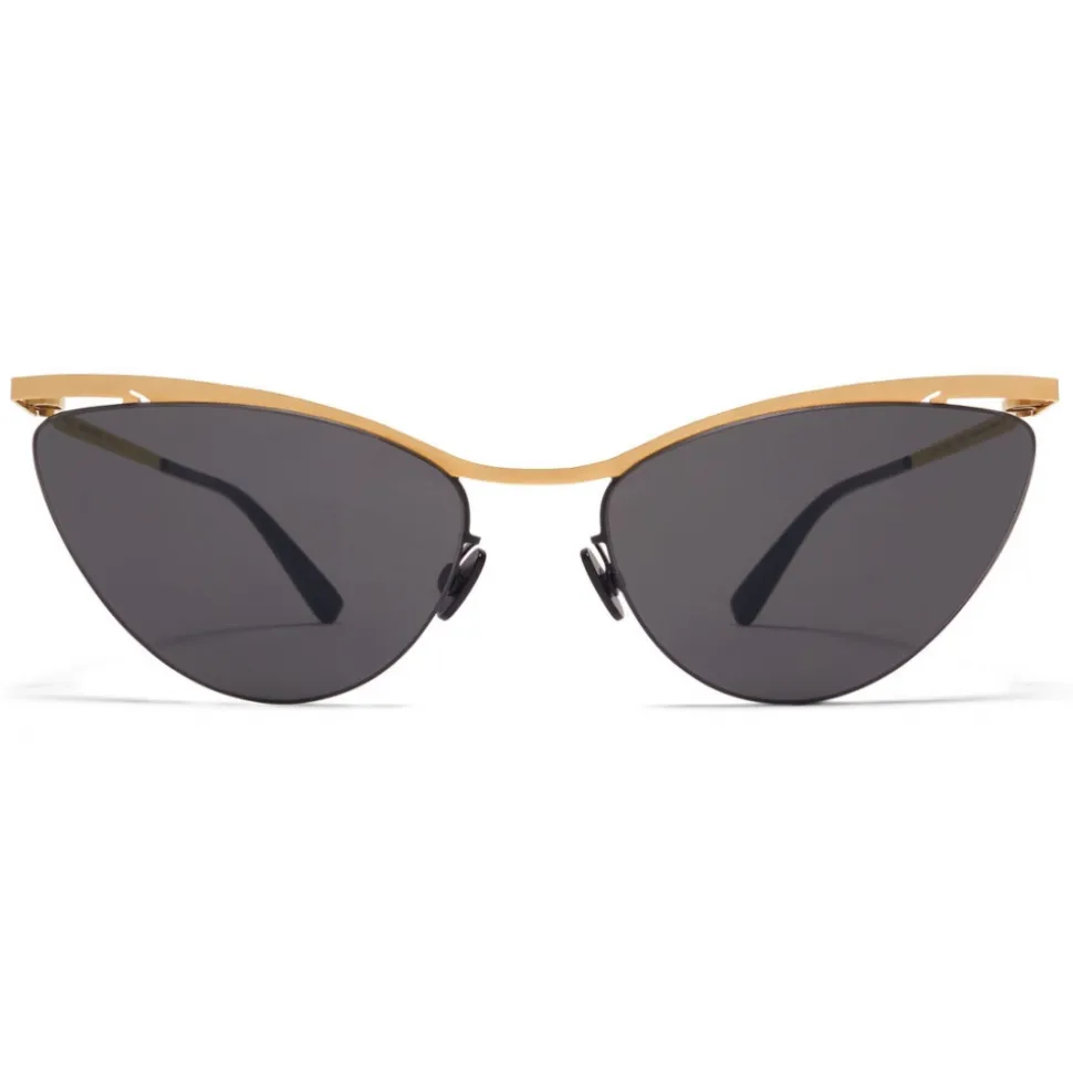 Made of lightweight stainless steel, MIZUHO in Gold/Black with Dark Grey Solid lenses is a butterfly-shaped sunglass frame from the MYKITA LESSRIM collection. Handcrafted in Berlin.