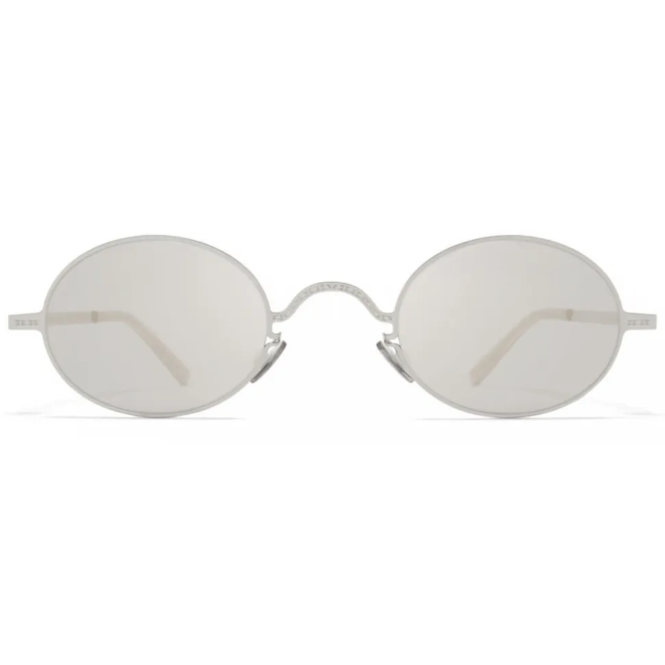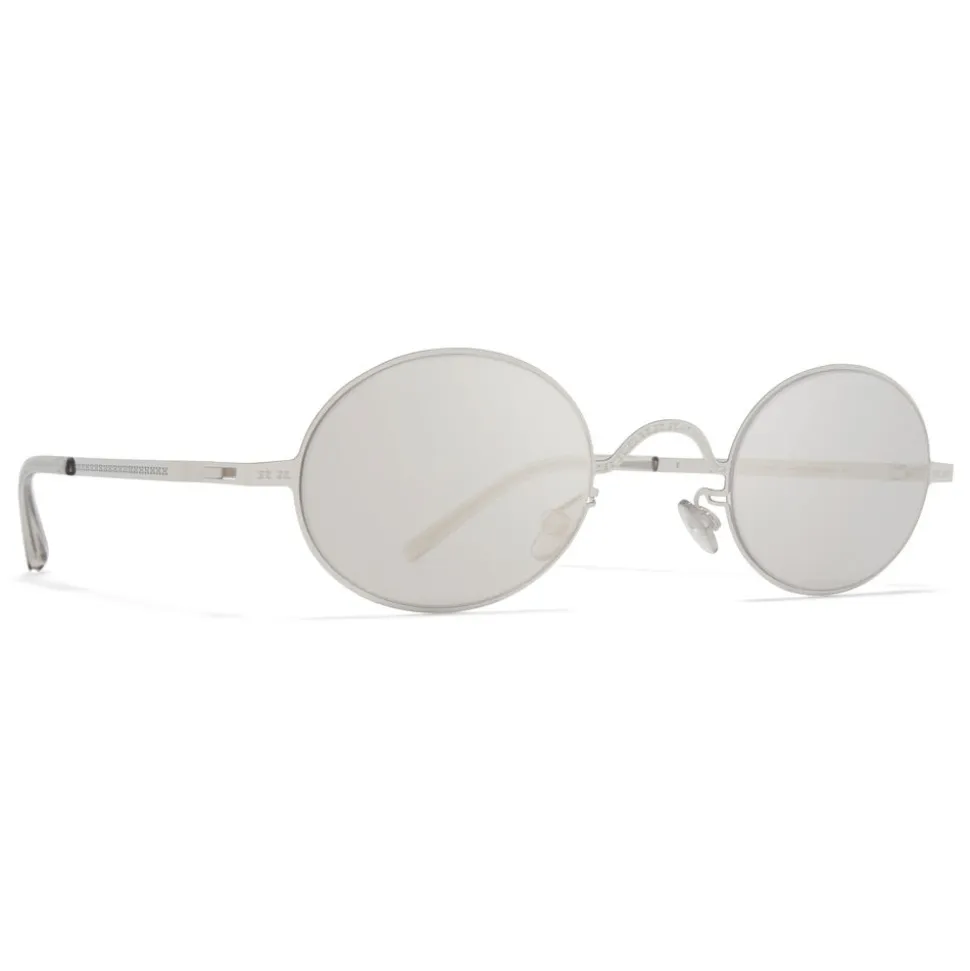 Made of lightweight stainless steel with functional details in acetate, MMCRAFT005 in Shiny Silver with Mauve Flash lenses is a oval-shaped sunglass frame from the MYKITA + MAISON MARGIELA collection. Handcrafted in Berlin.