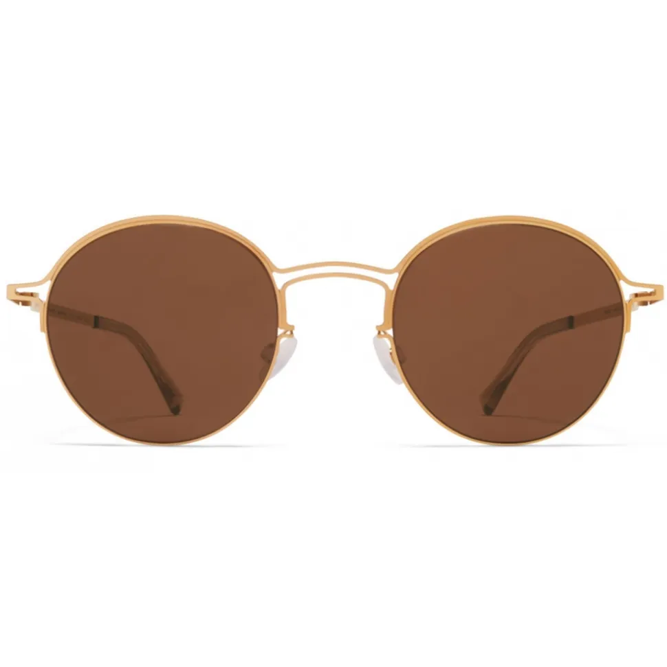 Made of lightweight stainless steel with functional details in acetate, MMCRAFT014 in Glossy Gold with Brown Solid lenses is a panto-shaped sunglass frame from the MYKITA + MAISON MARGIELA collection. Handcrafted in Berlin.
