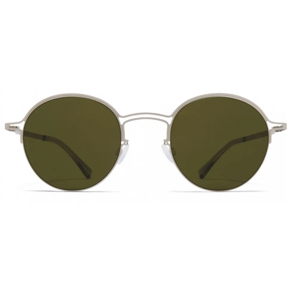 Made of lightweight stainless steel with functional details in acetate, MMCRAFT014 in Matte Silver with Raw Green Solid lenses is a panto-shaped sunglass frame from the MYKITA + MAISON MARGIELA collection. Handcrafted in Berlin.