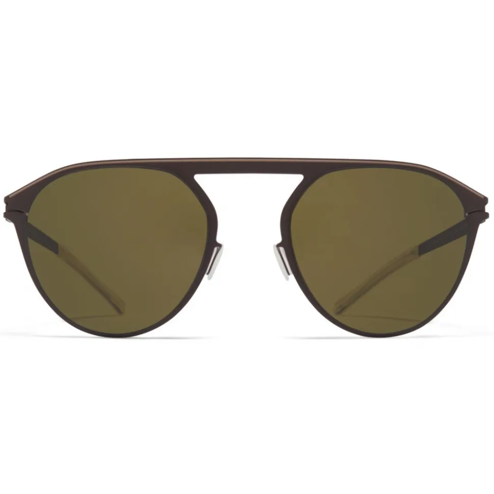 Made of lightweight stainless steel, PAULIN in Dark Brown/Dark Sand with Raw Green Solid lenses is a panto-shaped sunglass frame from the MYKITA NO1 collection. Handcrafted in Berlin.