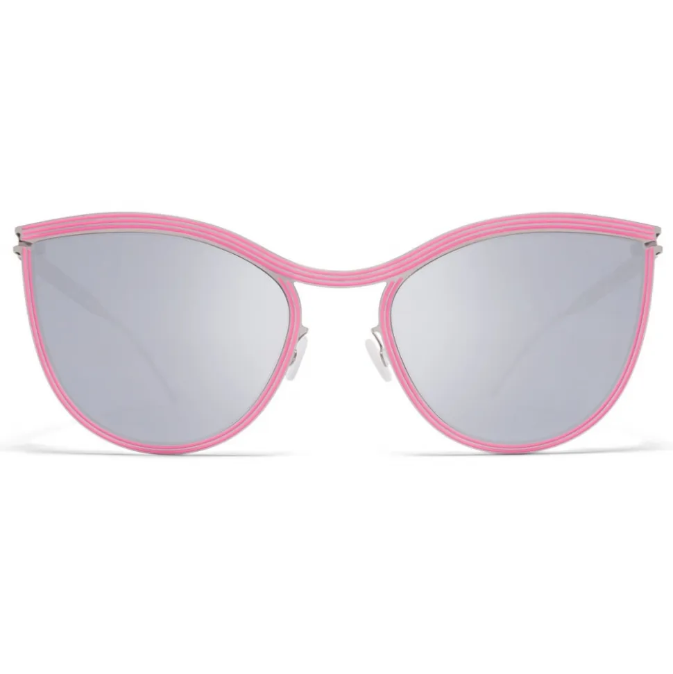Made of lightweight stainless steel, STUDIO 6.2 in Silver/Blossom with Silver Flash lenses is a butterfly-shaped sunglass frame from the MYKITA STUDIO collection. Handcrafted in Berlin.