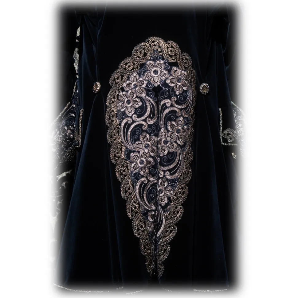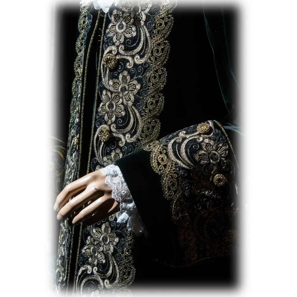 Costume in black velvet with gold embroidery, cashmere pattern with gold and black jewel buttons. Composed of inquartata, which is the jacket of the male costume of eighteenth-century style (the term may come from the four pieces processing of the head) adherent to the waist and goes down widening, giving a conical appearance to the figure, highlighting the waist.
