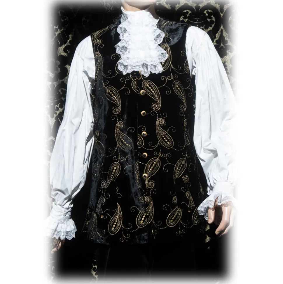 Worn open to let you see the vest and pants rather close to the knees with white silk socks, tight on the calves. The vest is made of black velvet with gold embroidery, Cashmere pattern with gold-black jewel buttons.