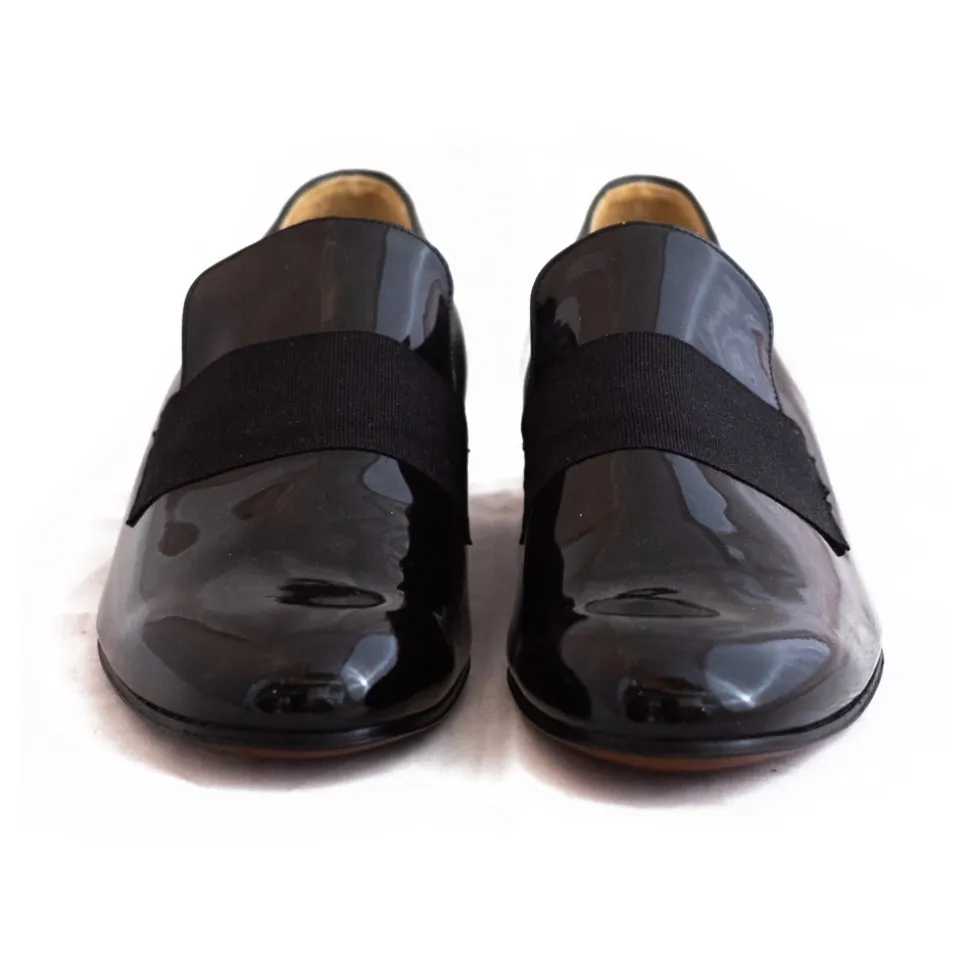 Handcrafted, elegant and evening slipper shoe for men, in black patent leather and grosgrain band.