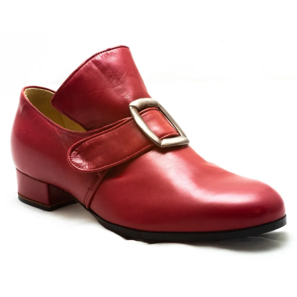 Shoe in very soft red brushed calfskin, real leather lining and leather sole, designed by Stefano Nicolao.