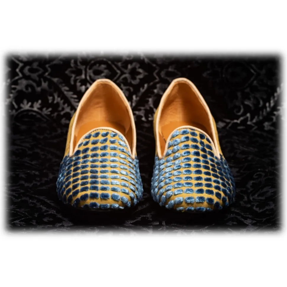 Nicolao Atelier – Silk Velvet Slipper Shoe – Blue Checkered Pattern Color on Gold Background Woman – Shoe – Made in Italy – Luxury Exclusive Collection