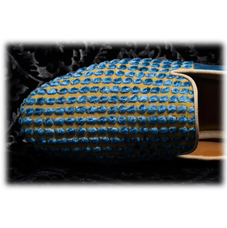 Nicolao Atelier – Silk Velvet Slipper Shoe – Light Blue Checkered Pattern on Gold Background Man – Shoe – Made in Italy – Luxury Exclusive Collection