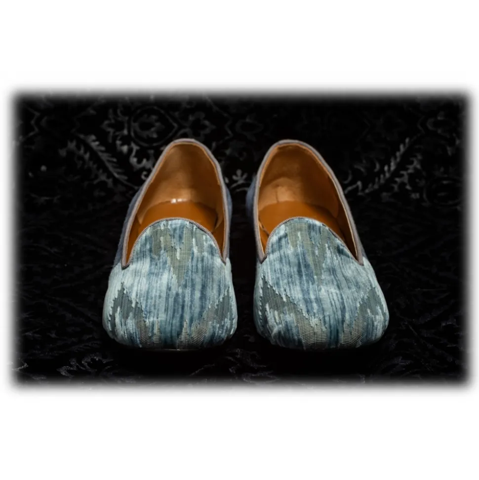 Nicolao Atelier – Silk Velvet Slipper Shoe – Light Blue Color with Tone on Tone Blaze Woman – Shoe – Made in Italy – Luxury Exclusive Collection
