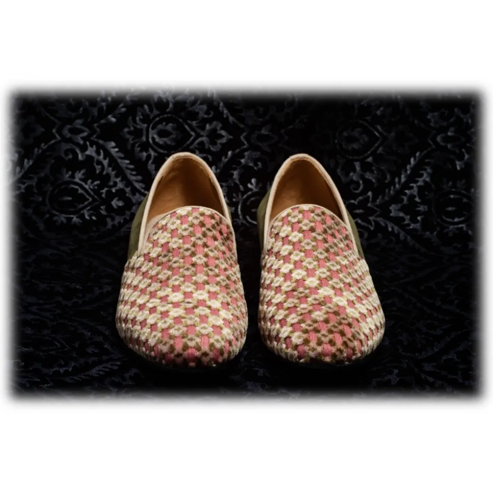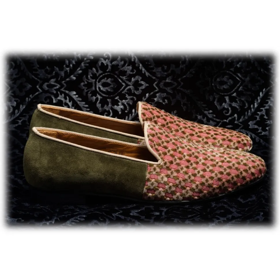 Nicolao Atelier – Slipper in Shaved Silk Velvet – Color Pink Moss Green and Beige Diamond Pattern Man – Shoe – Made in Italy – Luxury Exclusive Collection
