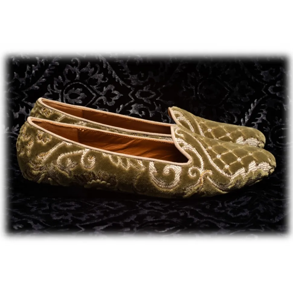 Nicolao Atelier – Slipper Shoe in Velvet Brocade – Sage Green Color with Inlay Pattern Woman – Shoe – Made in Italy – Luxury Exclusive Collection