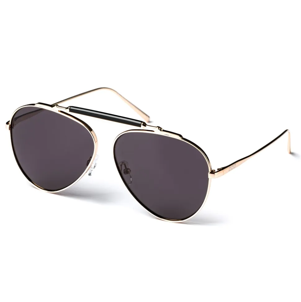 The model is available in 6 color variants. The first proposal is the model with an hour frame and shaded gold mirrored lenses. The second model has the frame in now with smoke black lenses. The third proposal is the model with blue mirrored lenses and gold frame. The fourth model features shaded silver mirrored lenses with a gunmetal frame. The fifth proposal has a gunmetal frame and brown lenses. The last proposal is fitted with mirrored gold lenses with a gold metal frame.