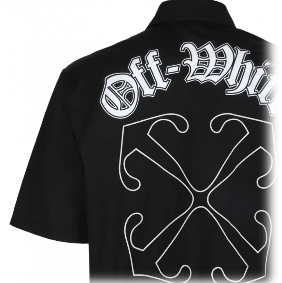 Off White Black Gothic Arrow Shirt. Black cotton poplin shirt, camp collar, short sleeves, embroidered logo to the front. Rear signature Arrows and logo motif, straight hem, front button fastening.