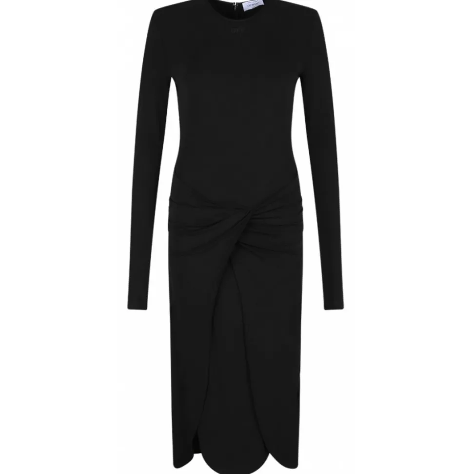 Off White Black Midi Dress. Black crepe texture midi dress, stretch design, high neck, long sleeves. Logo stamp to the front, twist detailing, front slit, below knee length.