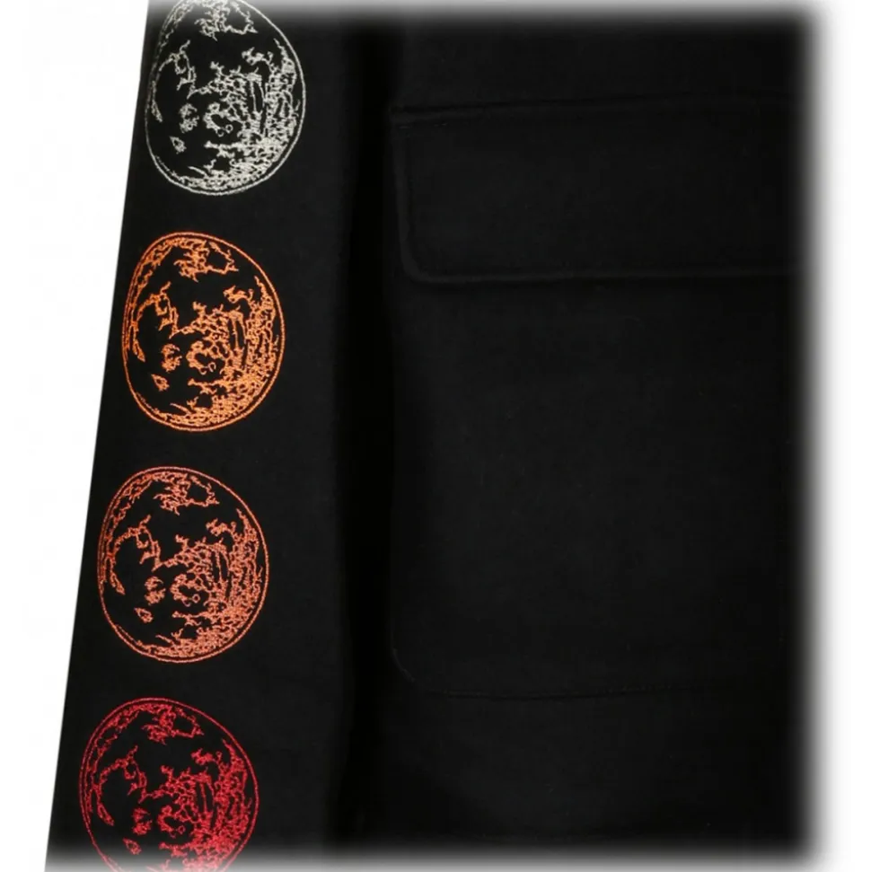 Off White Black Phase Varsity Jacket. Black virgin wool blend jacket, high neck, embroidered logo at the chest, graphic print to the rear, graphic print sleeves. Concealed front fastening, chest flap pockets, two front welt pockets, long sleeves and straight hem.