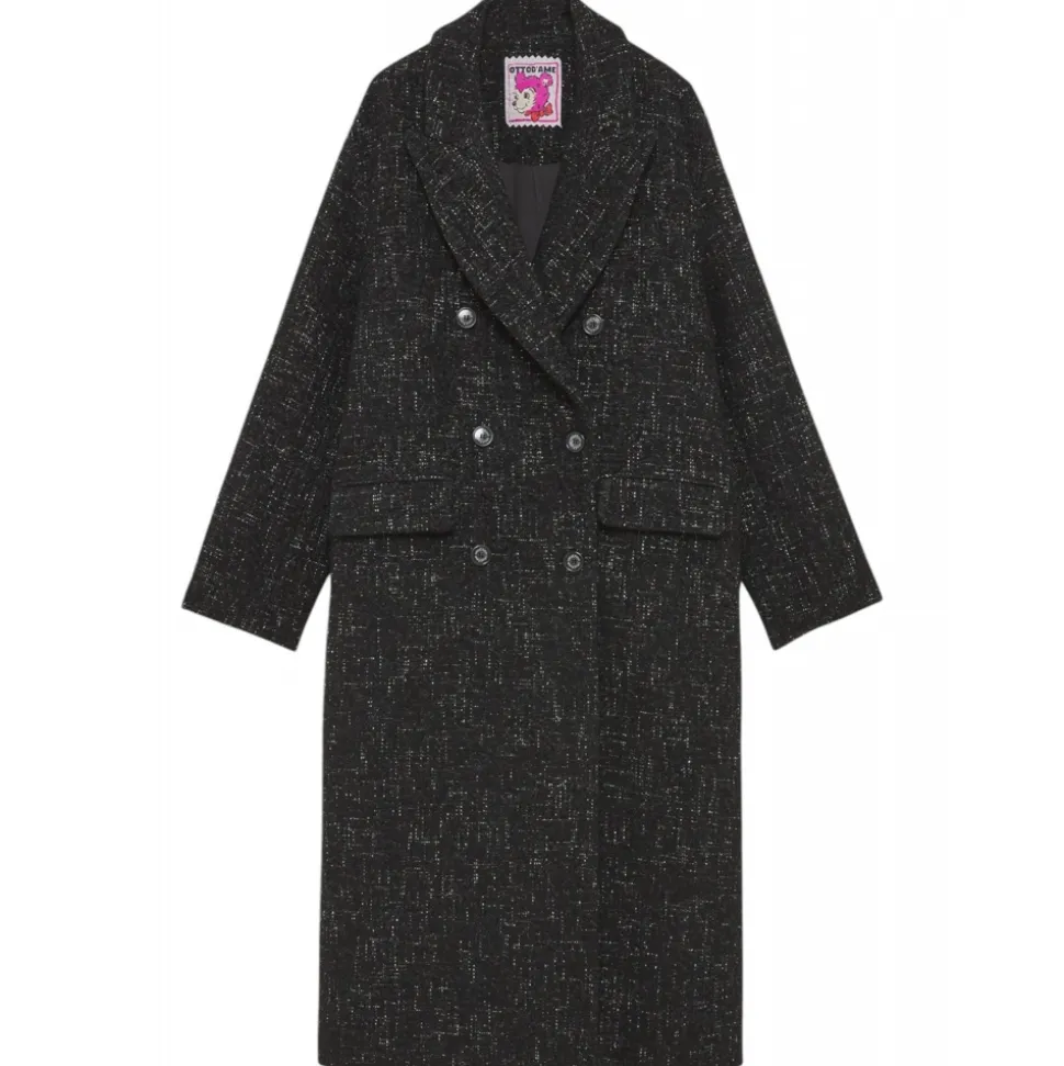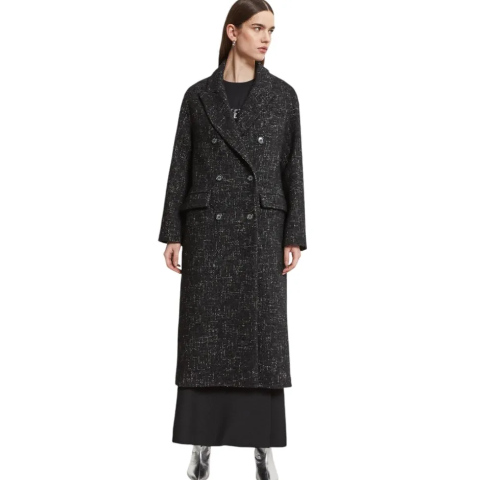 Ottod’Ame coat, long double-breasted model, in salt and pepper fabric. Over design, slit at the back, two flap pockets.