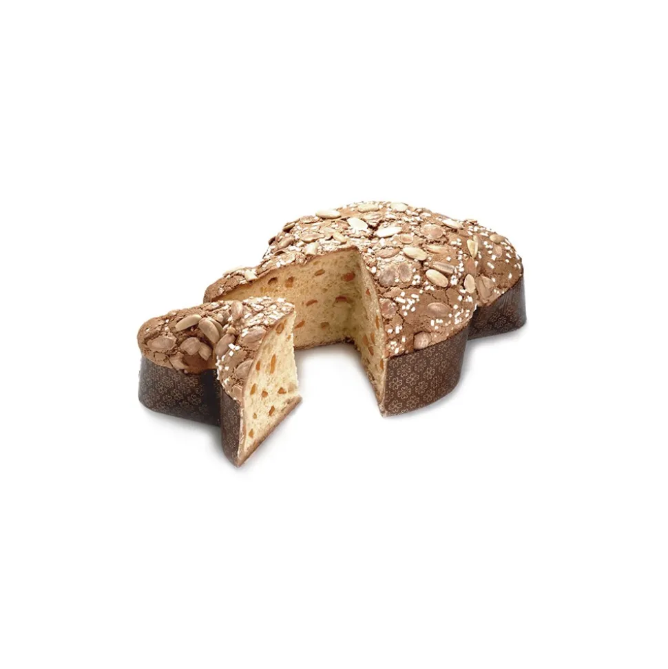 Easter cake in the shape of a dove, with a soft and fragrant dough obtained from the slow and natural leavening of our mother yeast and carefully selected ingredients. The cut gives off unmistakable scents of orange peel that are mixed with a glaze of crunchy almonds and delicious grains of sugar.