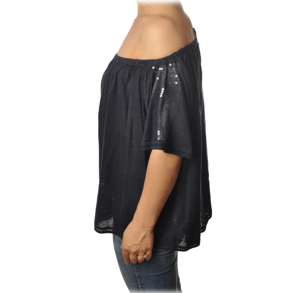 Patrizia Pepe blouse, soft model with elastic to wear with bare shoulders, short sleeves with sequins in pure linen.
