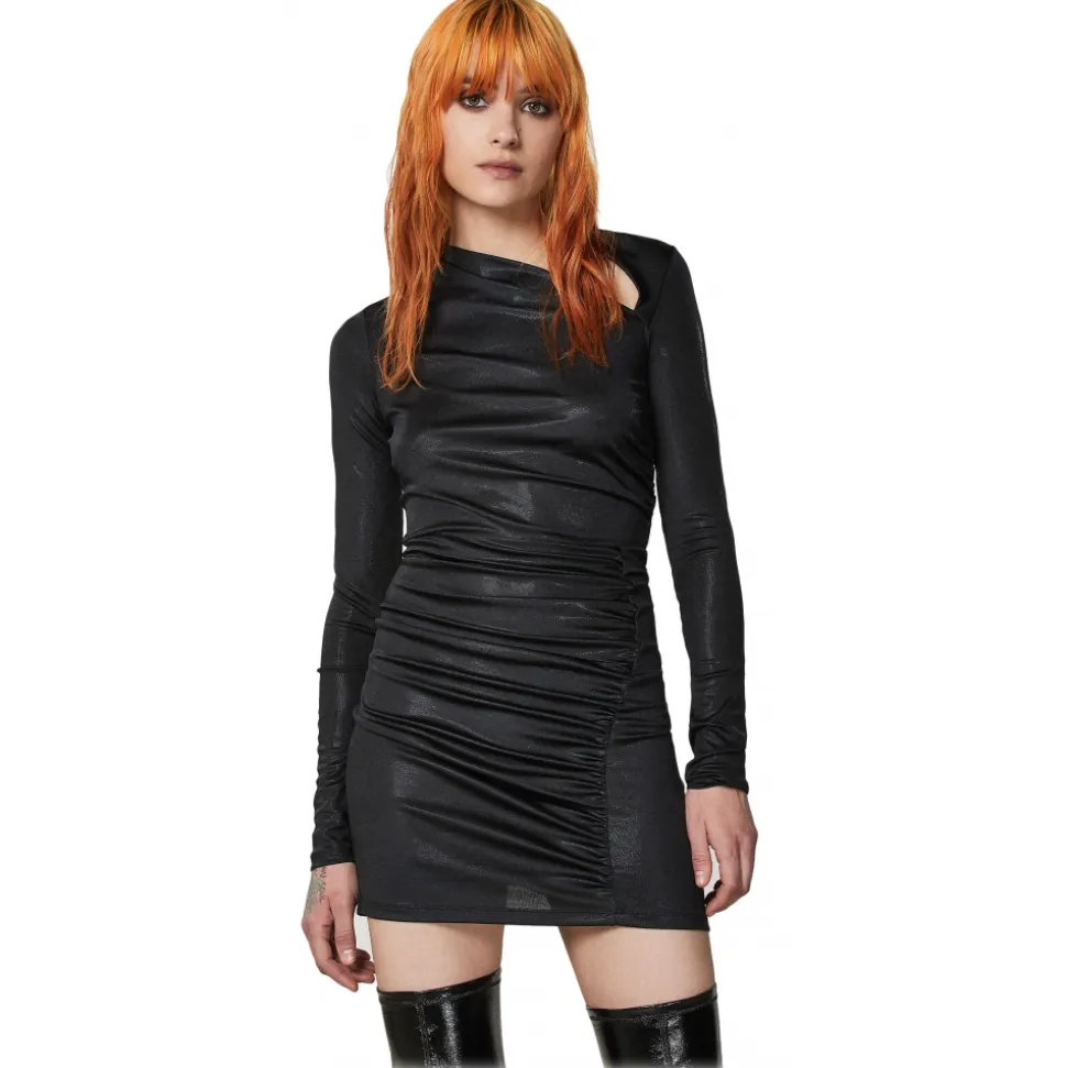 Patrizia Pepe dress with long-sleeve, asymmetrical collar, draped skirt, in shiny stretch fabric.
