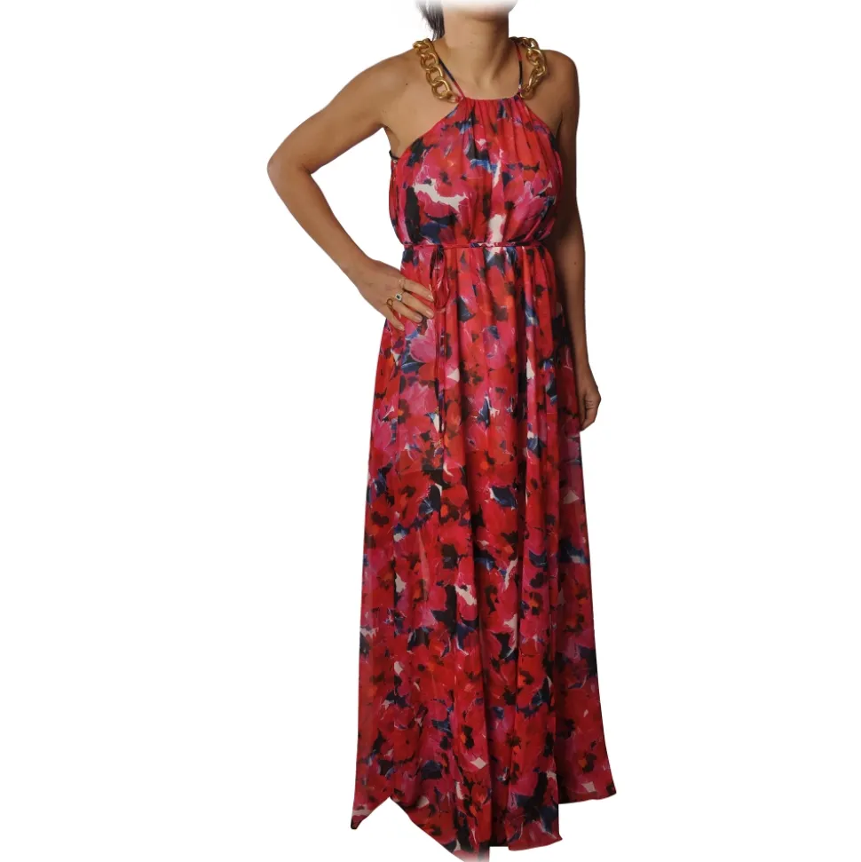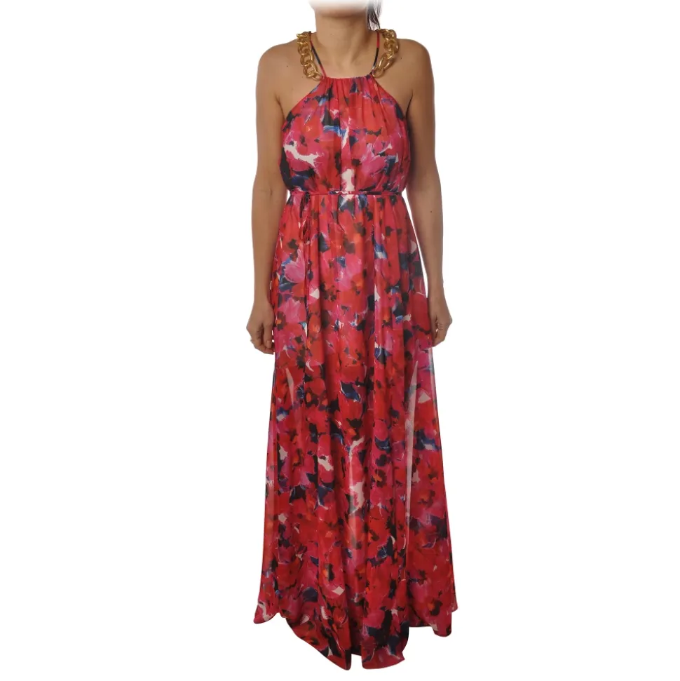 Patrizia Pepe dress, long and wide model, with fine straps and removable gold metal chain, in floral pattern, with small belt in the same fabric.