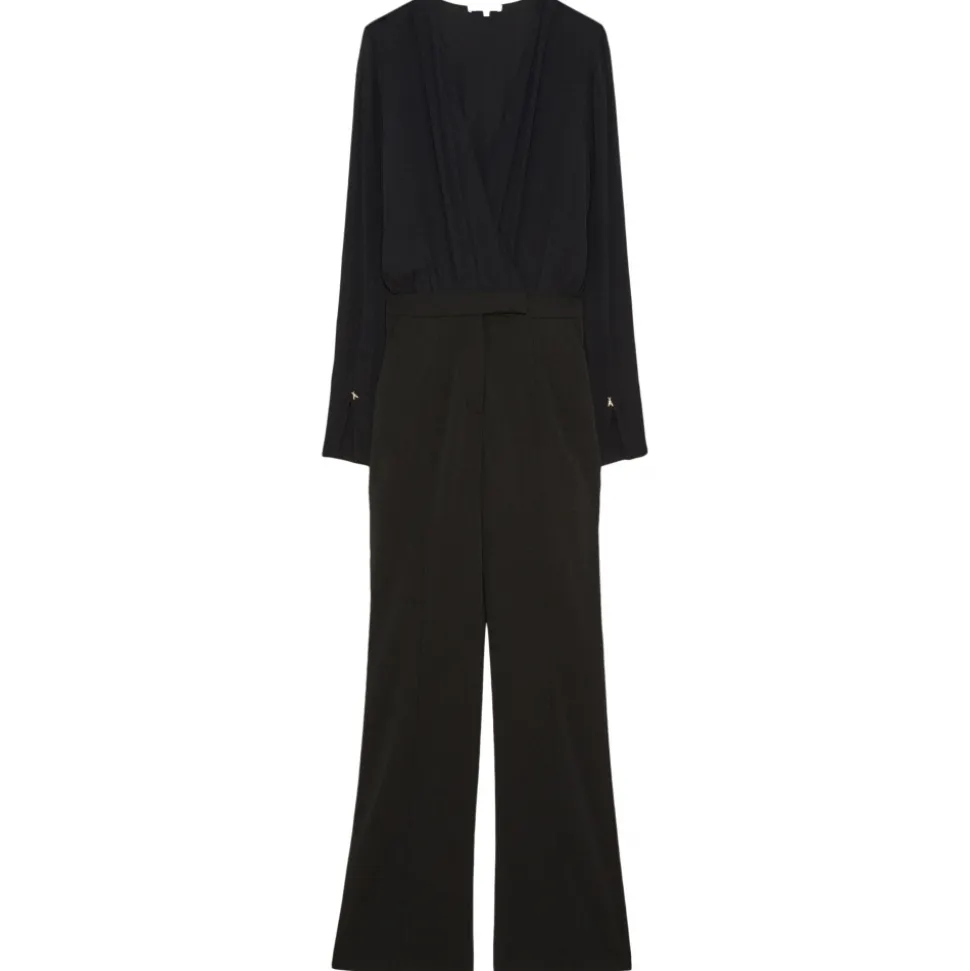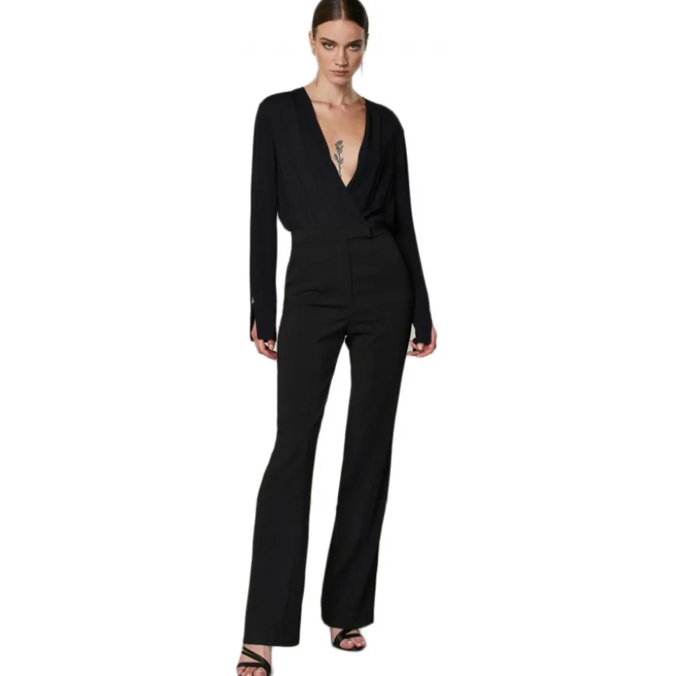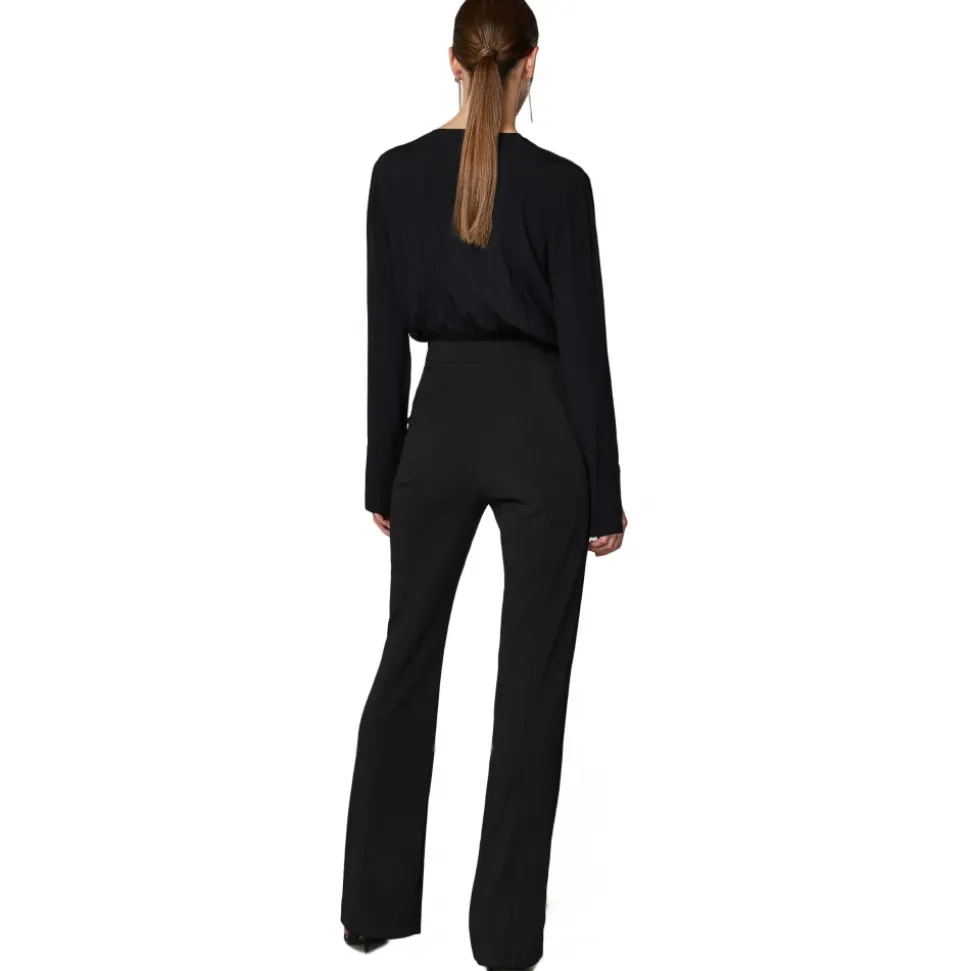 Patrizia Pepe jumpsuit, model with long-sleeved soft blouse and crossover ‘V’ neckline on top, high-waisted trousers in stretch fabric underneath, with chinos pocket on front and visible stitching on front and back, flared.