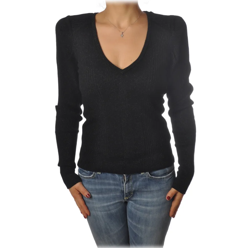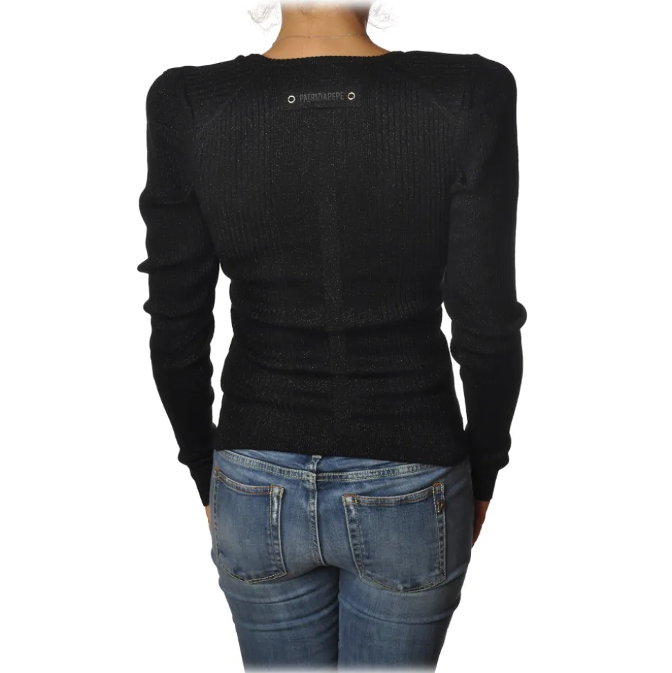 Patrizia Pepe sweater, long sleeve V-neck model, in ribbed stretch yarn with lurex, with shoulder straps, logo on the back of the neck.