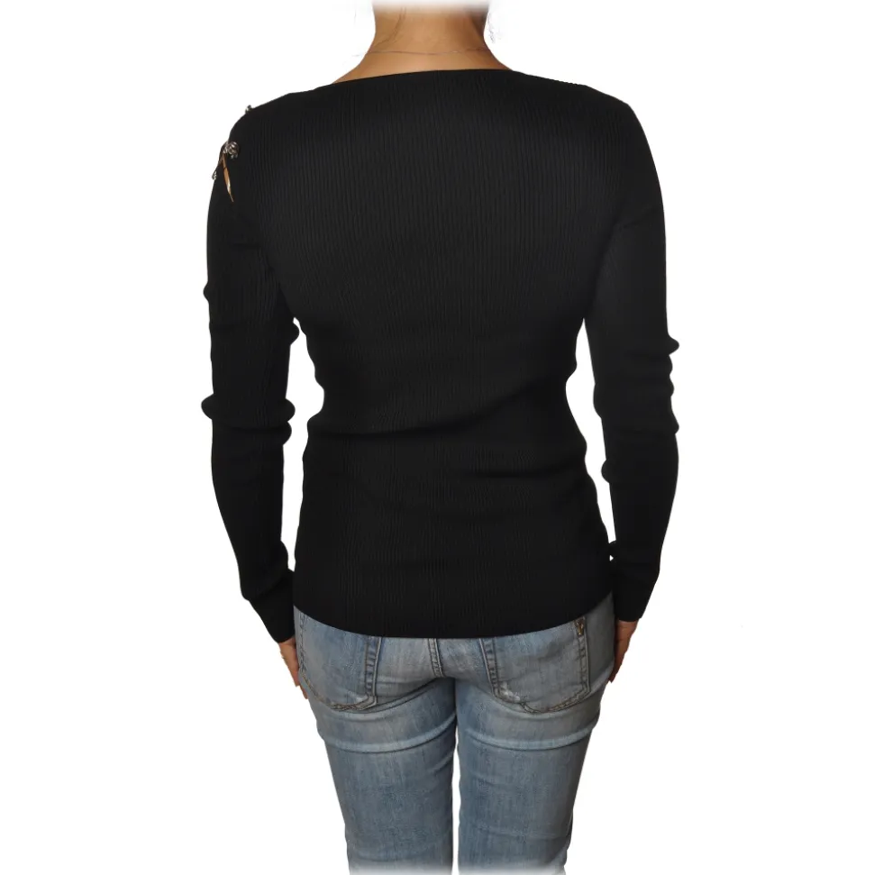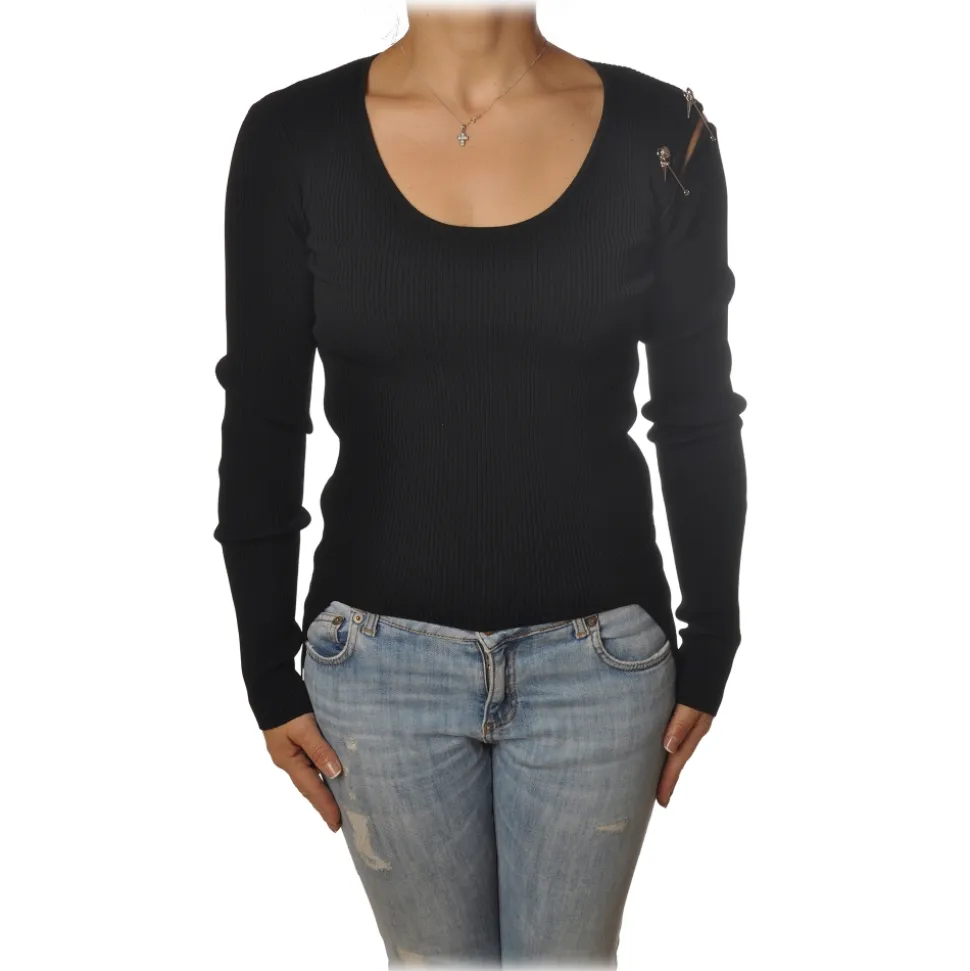 Patrizia Pepe sweater, long-sleeved Madonna neckline model, in stretch ribbed fabric, with opening on the shoulder and brooches detail on one side.