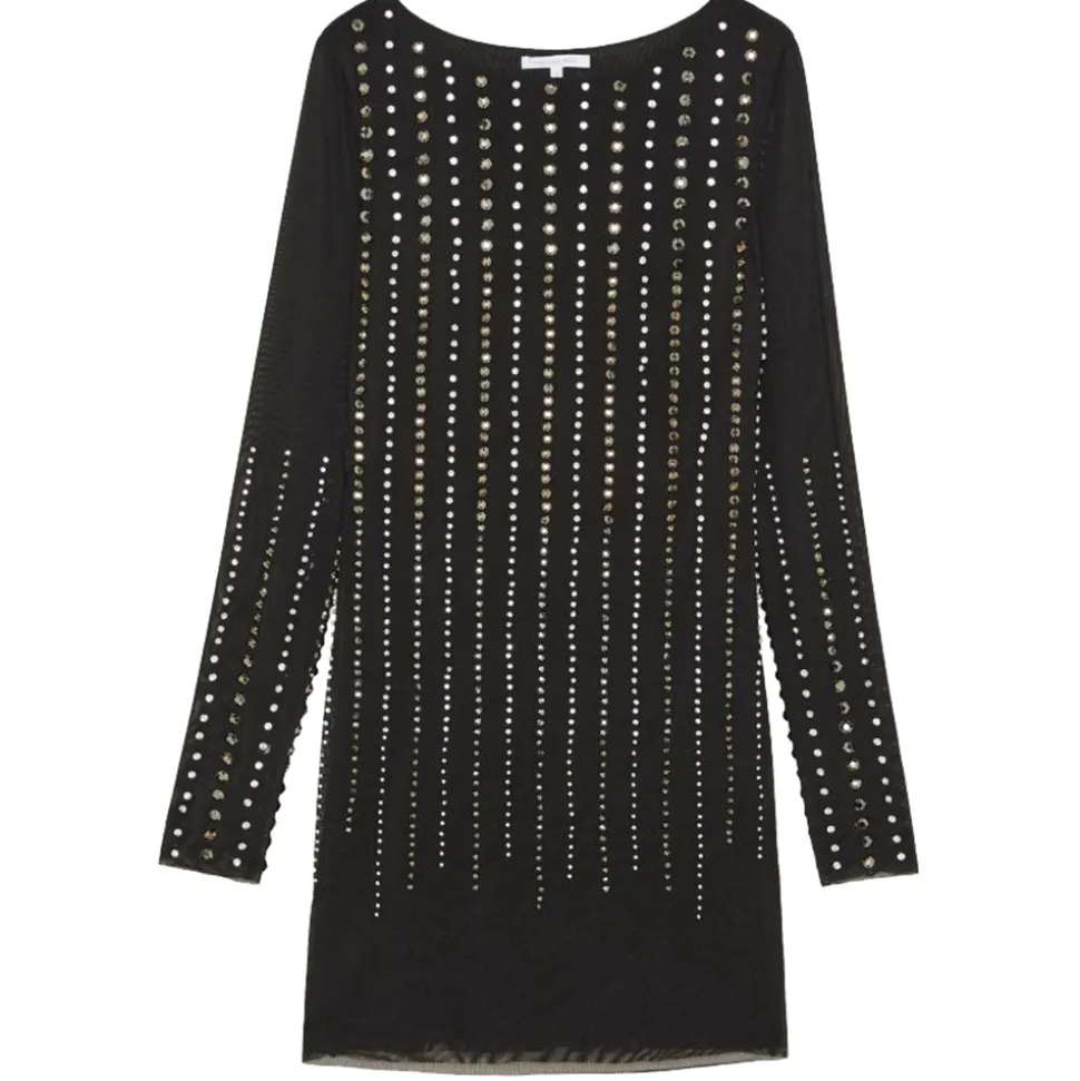 Patrizia Pepe dress, narrow model with long sleeves and boat neckline, in light transparent tulle fabric with applied bezels and rhinestones.