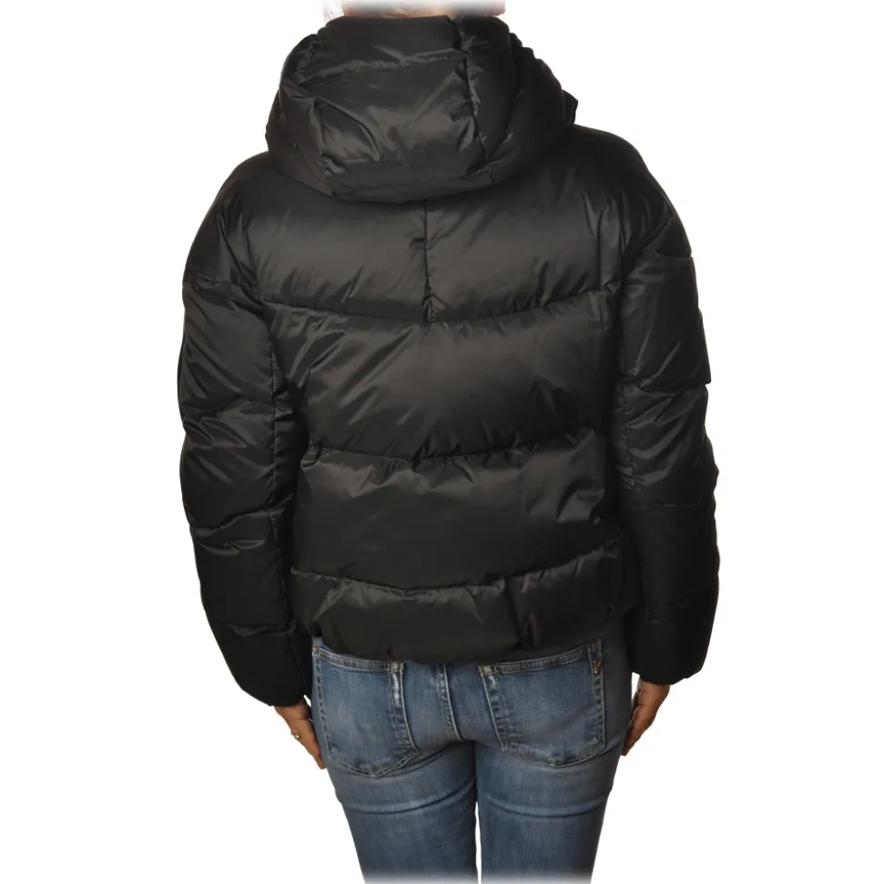 Peuterey jacket, Carena model, short egg-shaped model taken up at the bottom by elastic, with fixed hood, contrasting zip and welt pockets, with quilted fabric, padded with down.
