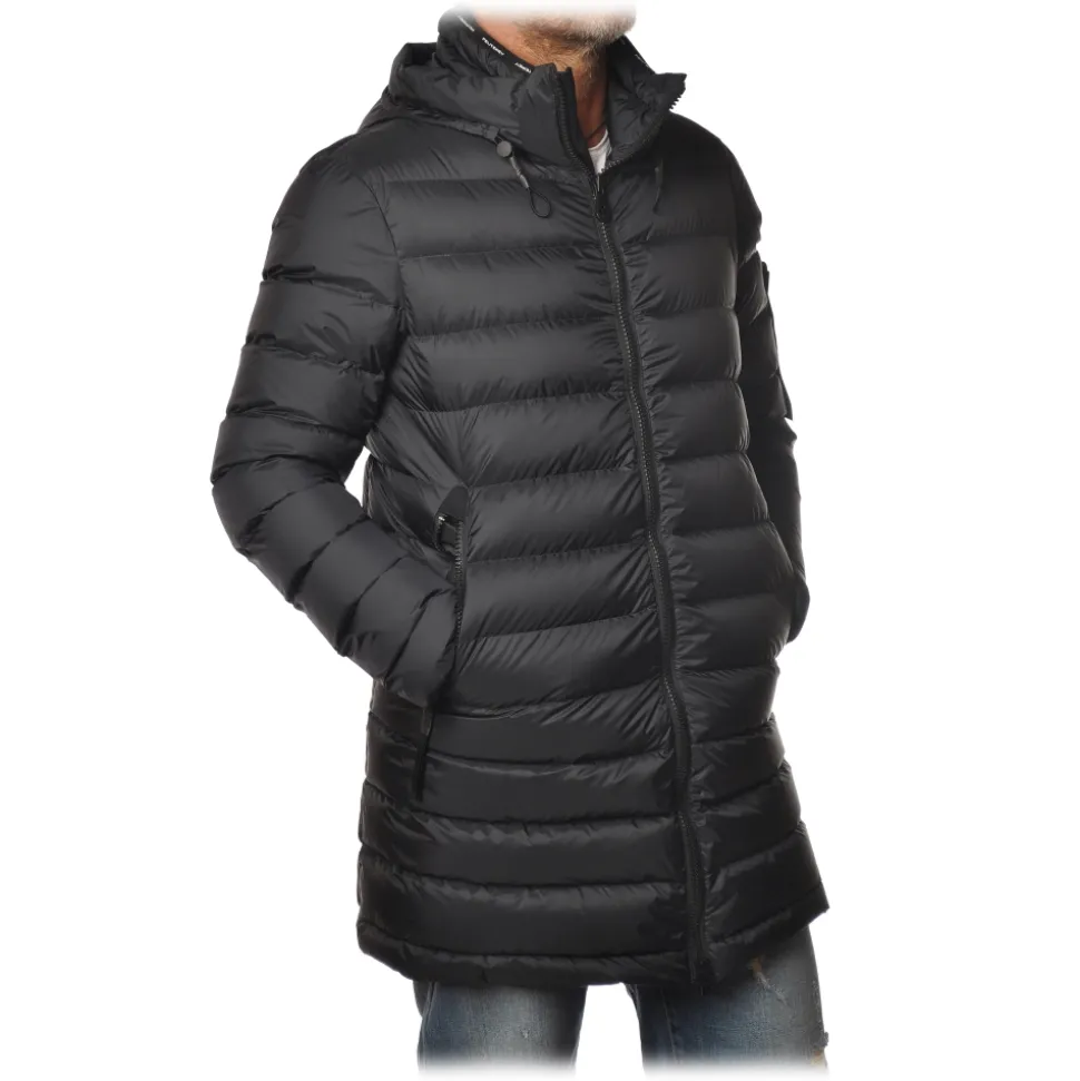 Peuterey jacket, Rubio model, 3/4 model with hood and standing collar, stitched fabric, with visible zip closure, two pockets, feather padding.
