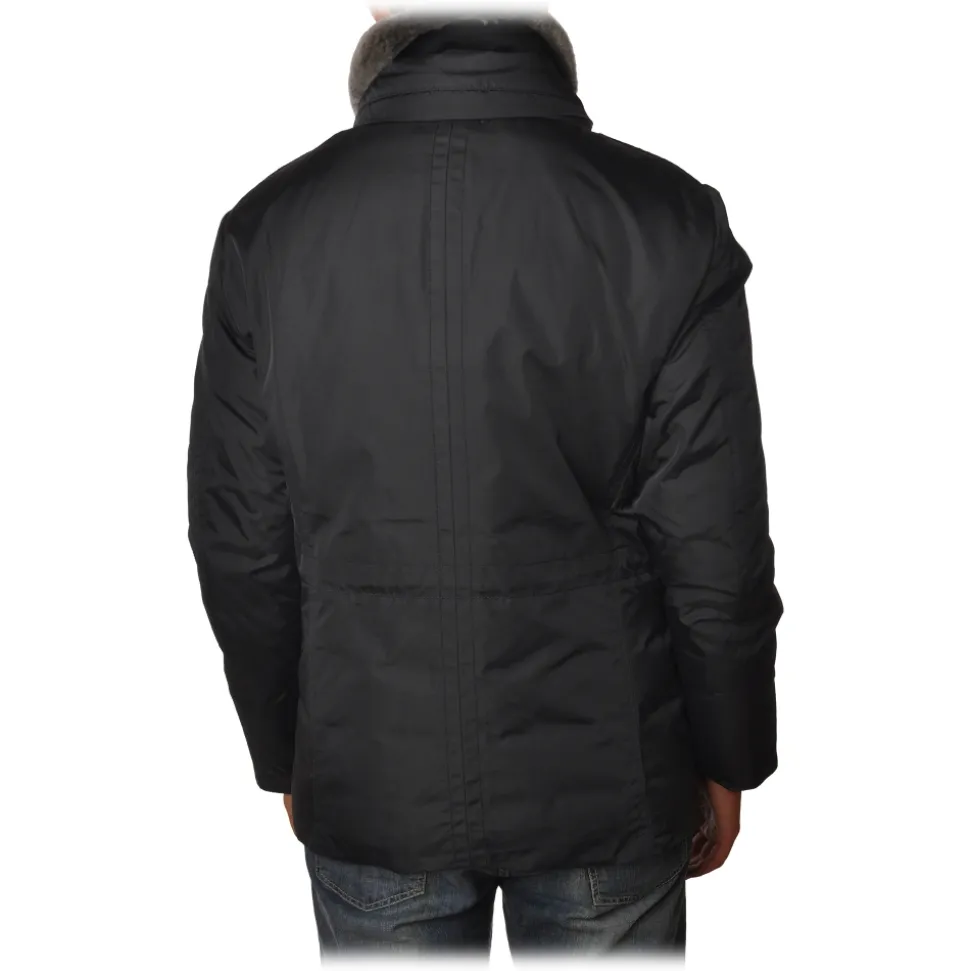 Peuterey jacket, 3/4 long model with drawstring at the waist, four patch pockets, with removable fur collar, shiny water-repellent fabric, feather padding.