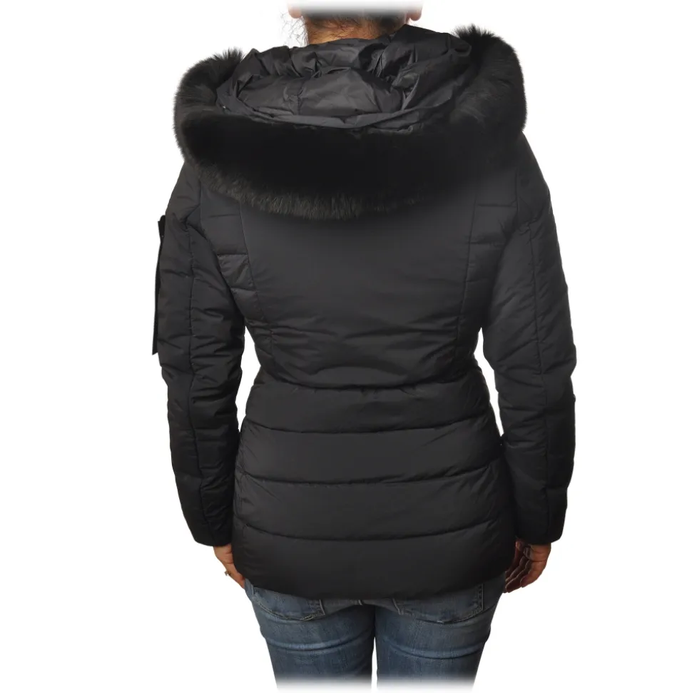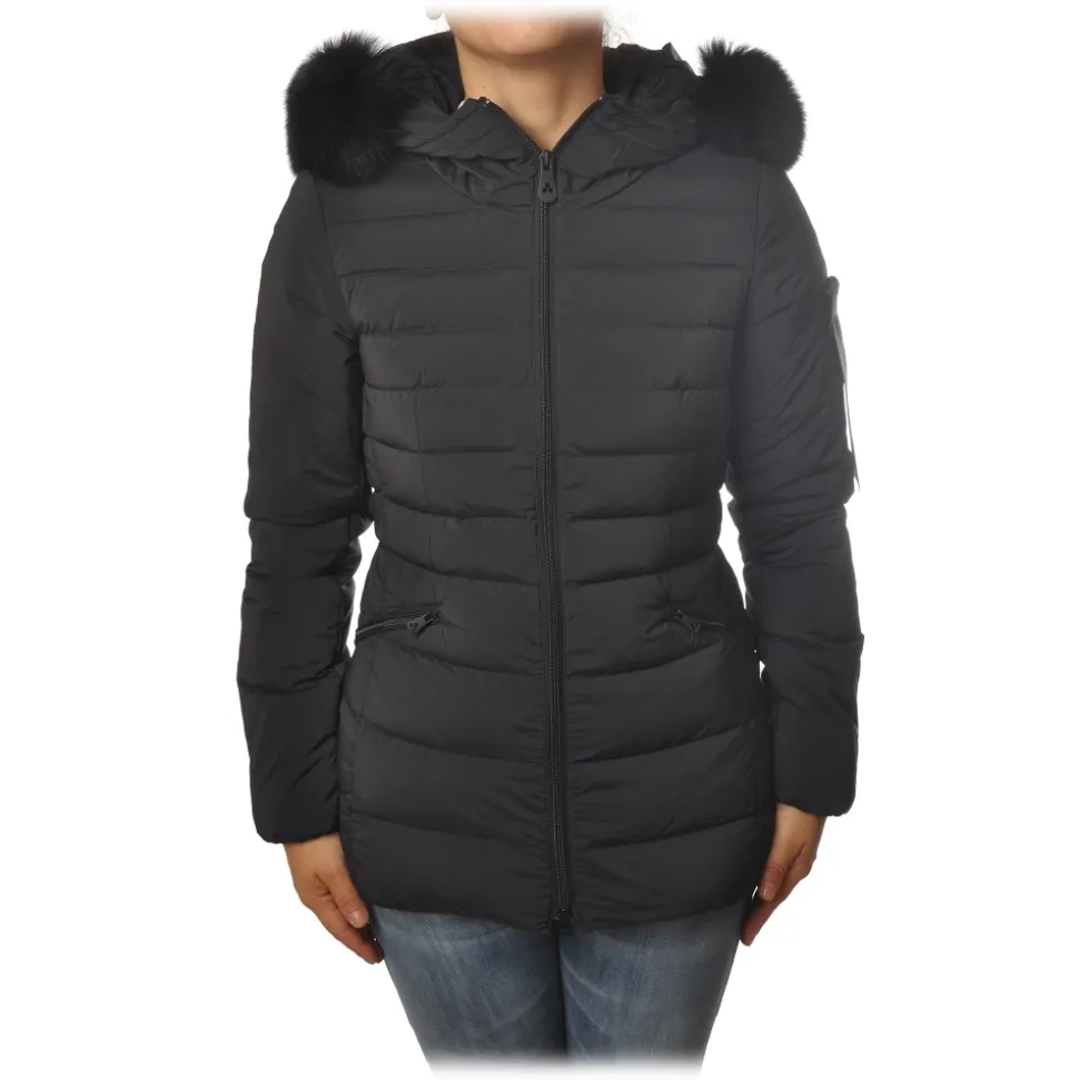 Peuterey jacket, Turmalet model, screwed with stitched fabric only on the front, smooth fabric sleeves, complete with hood finished with real fur, with zip closure and two oblique pockets.