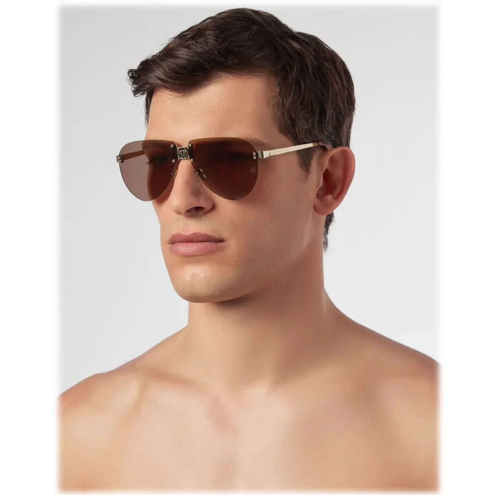 Philipp Plein Skull Collection aviator sunglasses. Rimless metal frame sunglasses with brand logo and drop design edges.