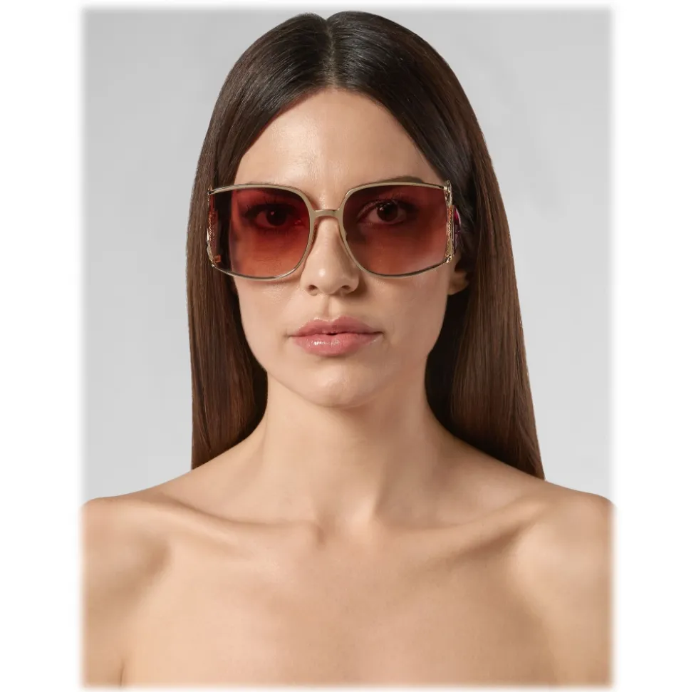 Philipp Plein Flamant Collection oversize sunglasses. Metal frame sunglasses with mother of pearl and crystal of rocca, side flamingo. Nickel.