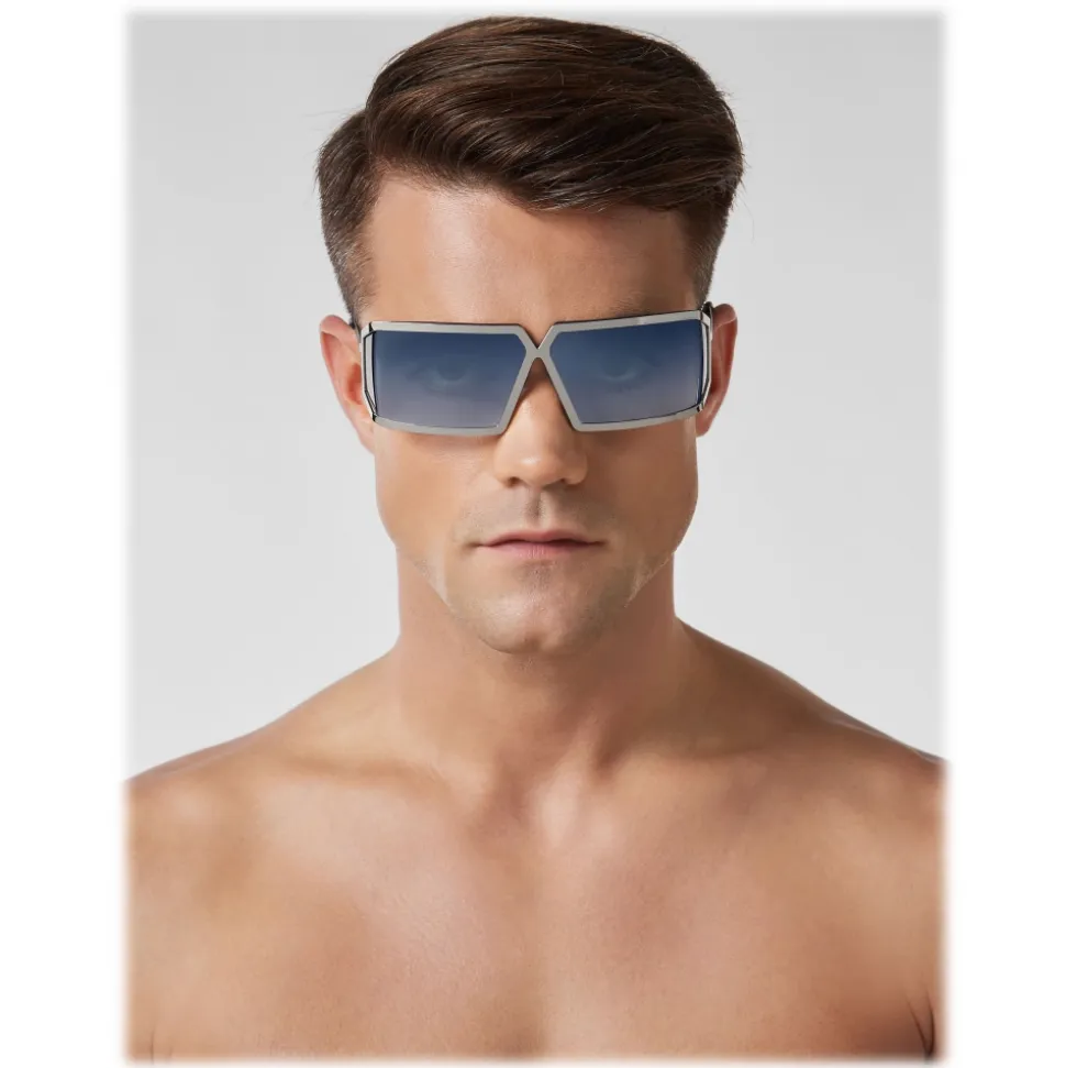 Philipp Plein Skull Collection mask sunglasses. Metal frame sunglasses with squared edges and colored lenses.